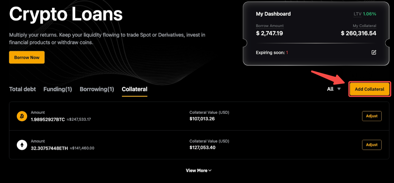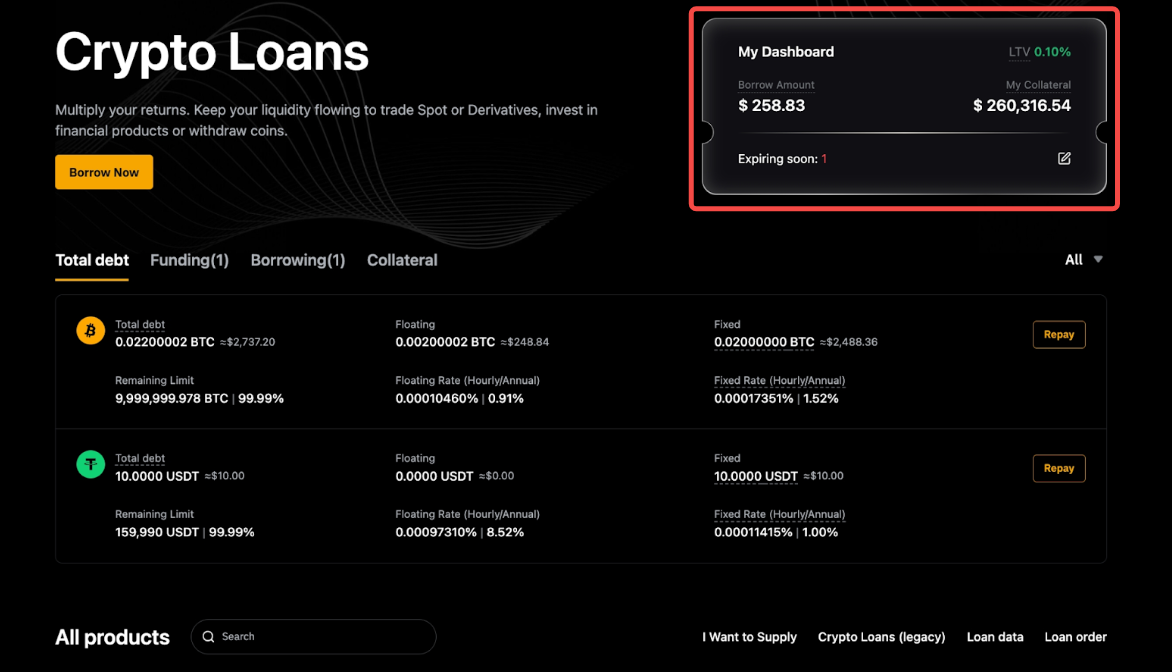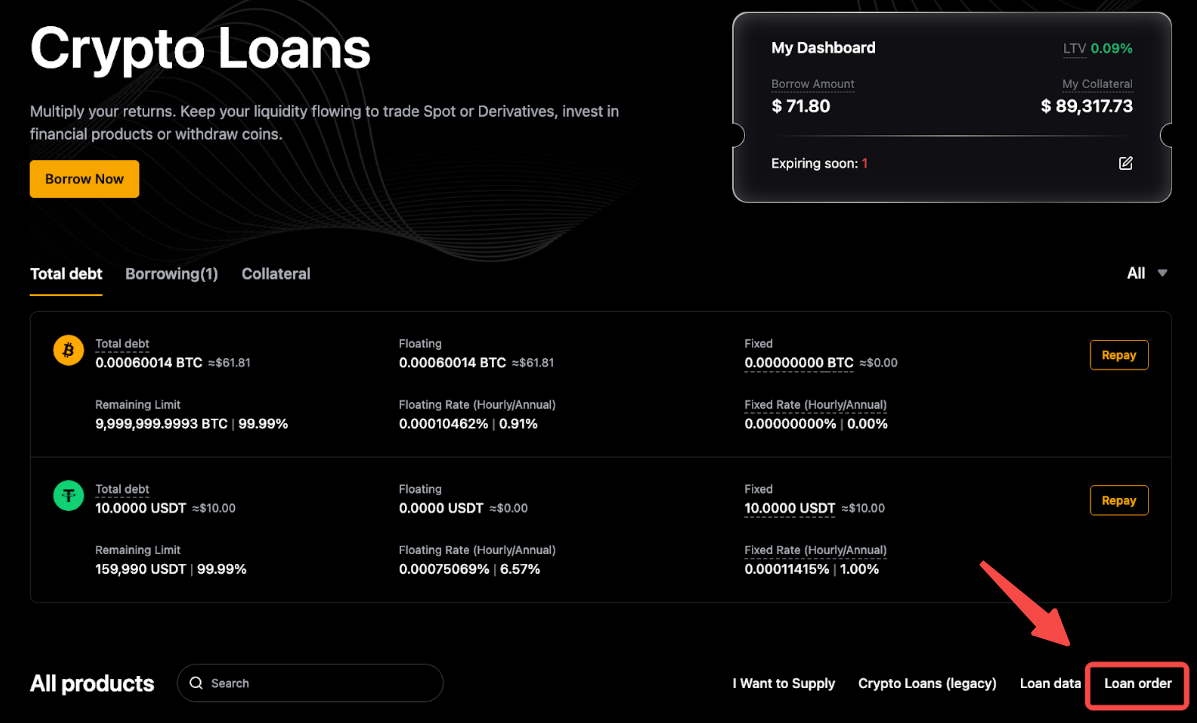 Para comprobar tus préstamos, ve a la página de inicio Préstamos cripto y verás una descripción general de tus préstamos, garantías y órdenes totales.