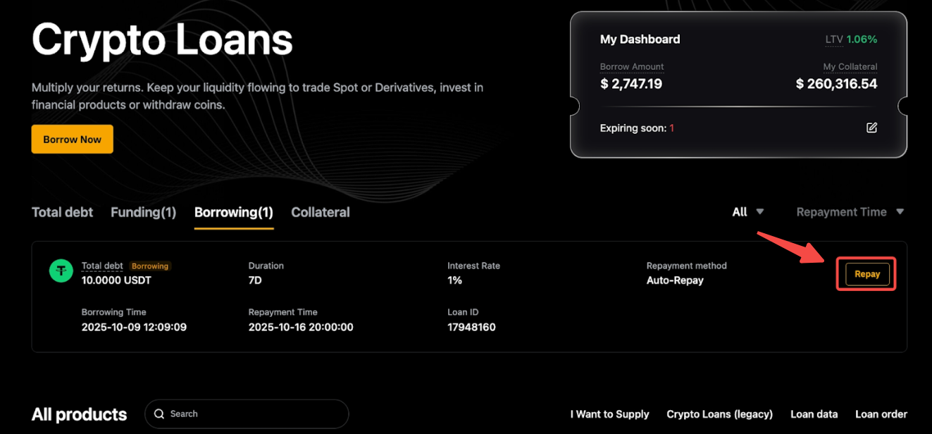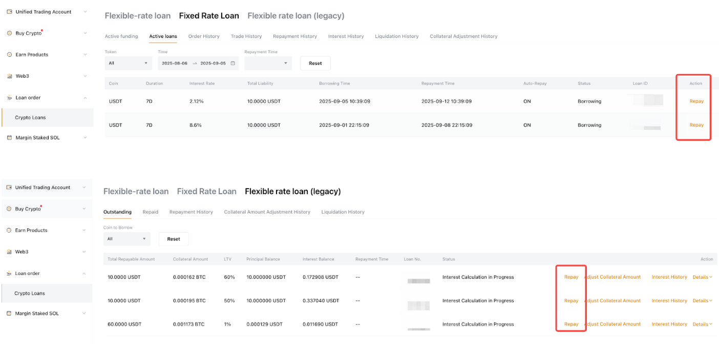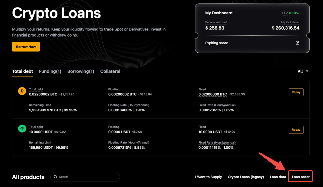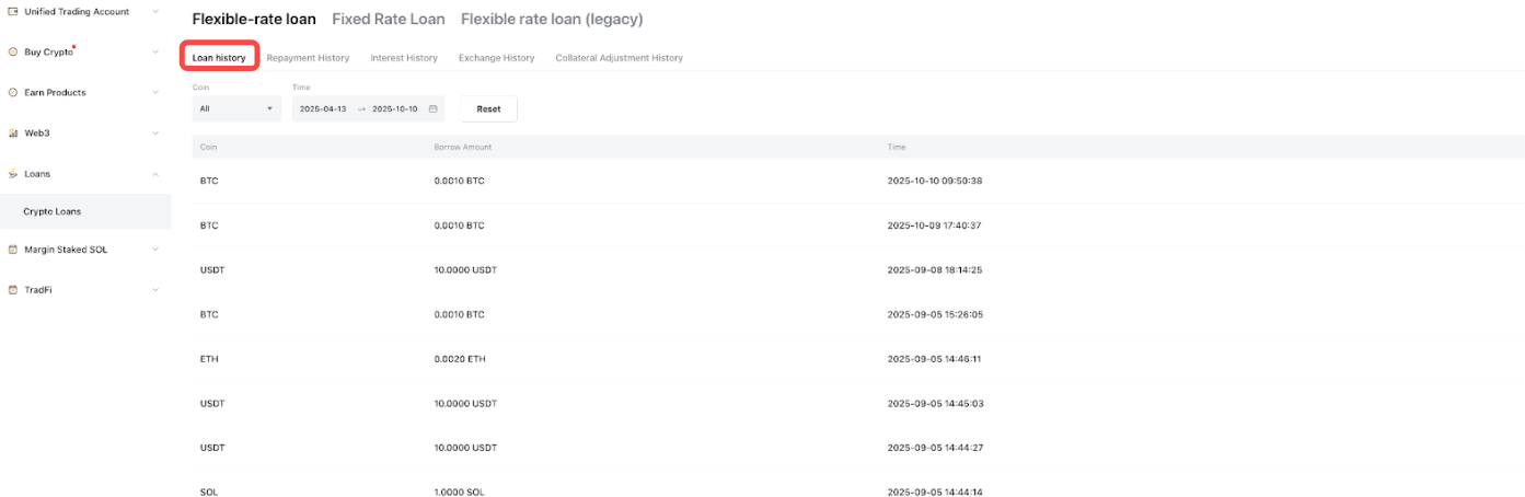 Para ver una lista completa de todas tus órdenes, haz clic en Orden de préstamo en el Panel de información general. Puedes ver todas las órdenes de Préstamos Cripto cambiando las pestañas del producto en la parte superior, incluido el Préstamo (Fijo) y Préstamo de Tasa Flexible, con información detallada sobre tu préstamo, reembolsos, intereses, garantía y más. También puedes filtrar por activo o tiempo para limitar los resultados.