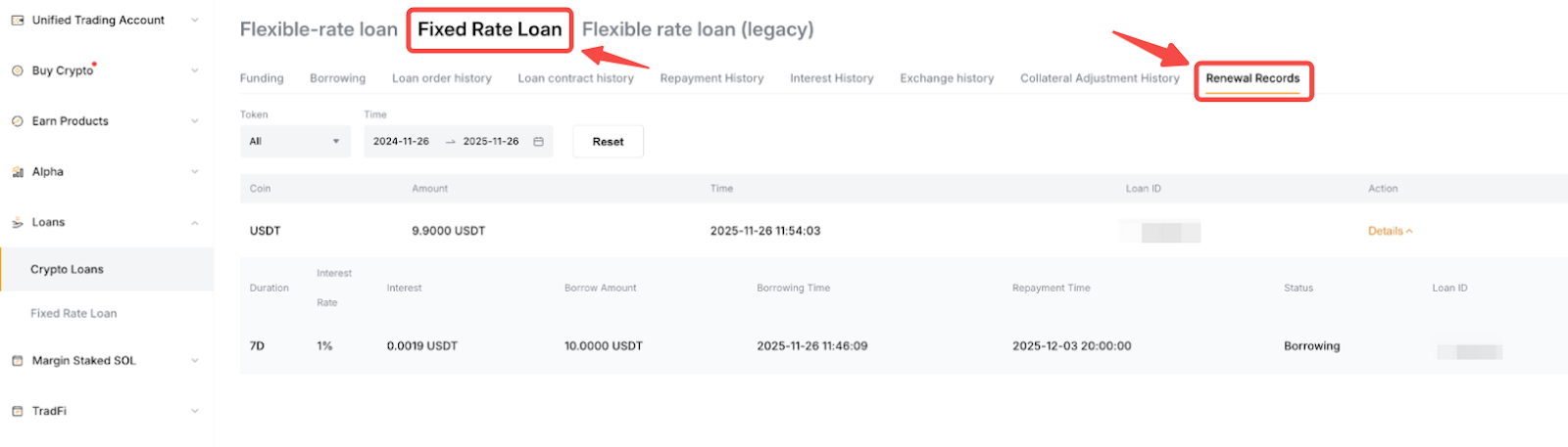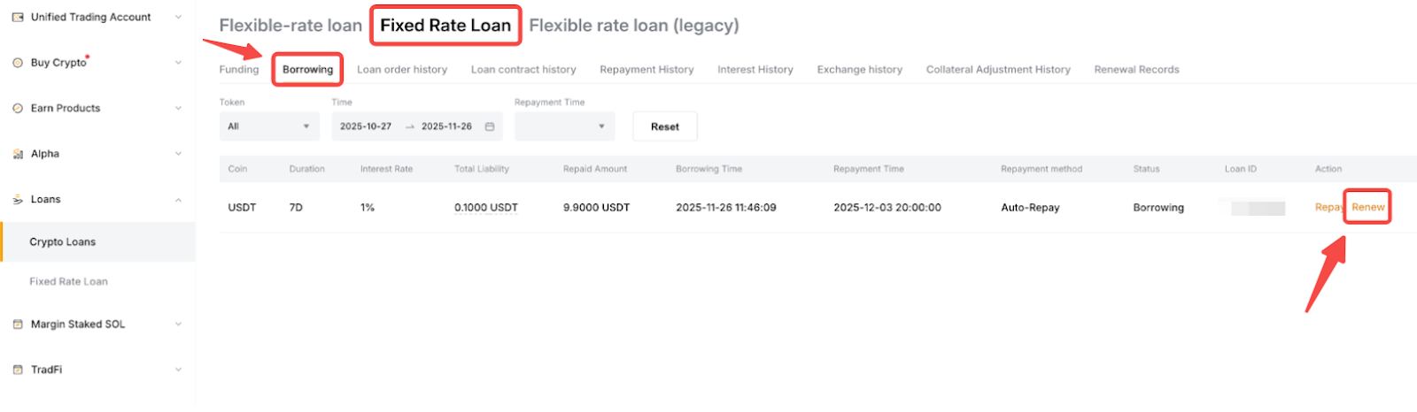 Para ver sus registros de renovación, puede hacer clic en Órdenes de préstamo en el Panel de información general → Préstamo con tasa fija → Registros de renovación.