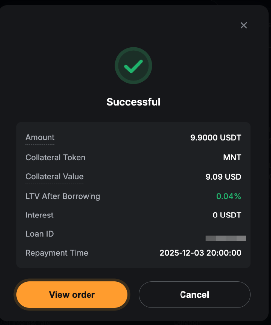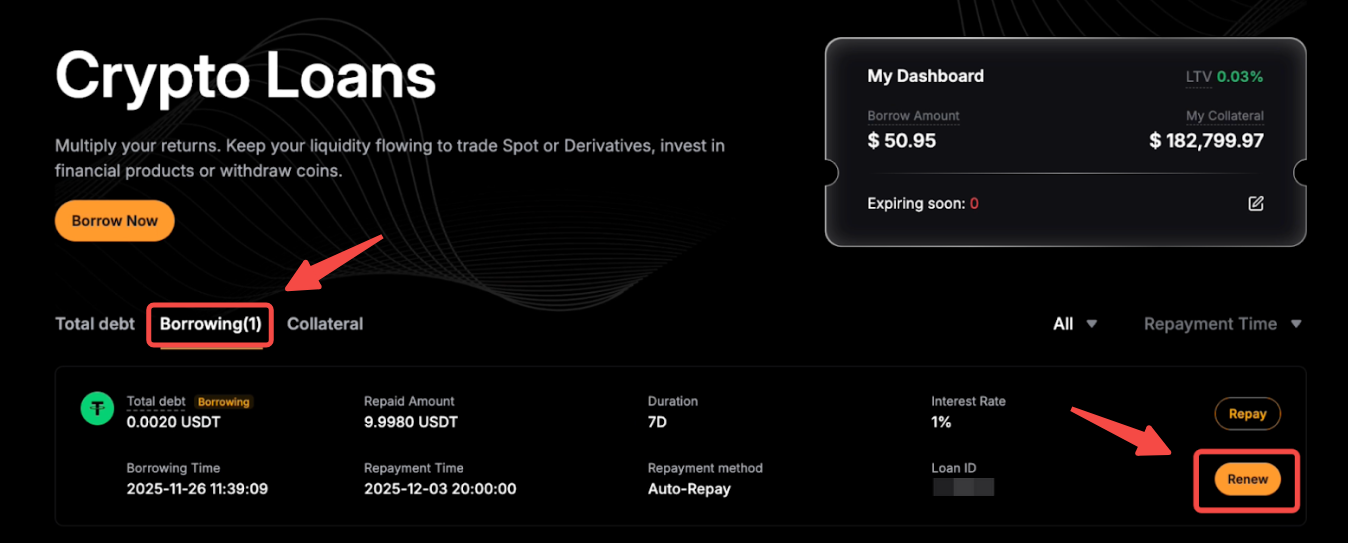 La función Renovación de préstamo solo está disponible para ordenes ya pagadas con un importe superior a 0 y más de 6 horas antes de la fecha de vencimiento. Tenga en cuenta que cada contrato de préstamo puede renovarse hasta 5 veces.