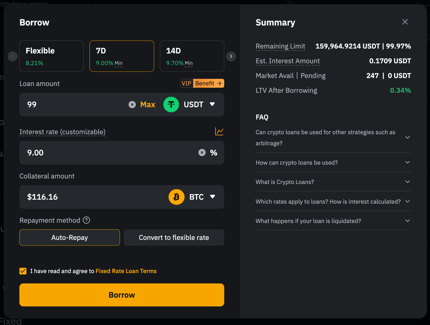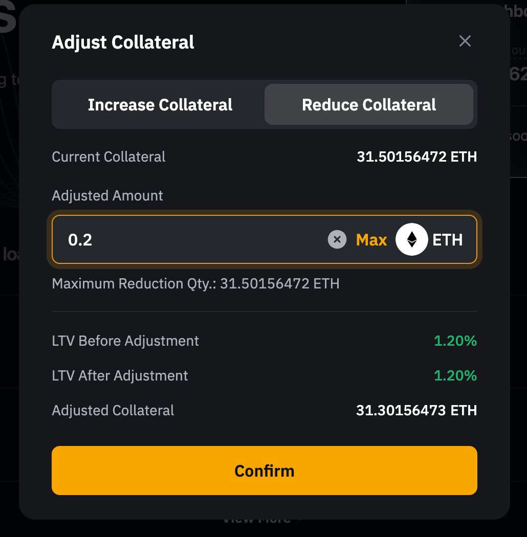 2. Importe del préstamo: Haz clic en Max para pedir prestado el importe máximo permitido en función del valor de tu garantía y el límite de préstamo del activo.