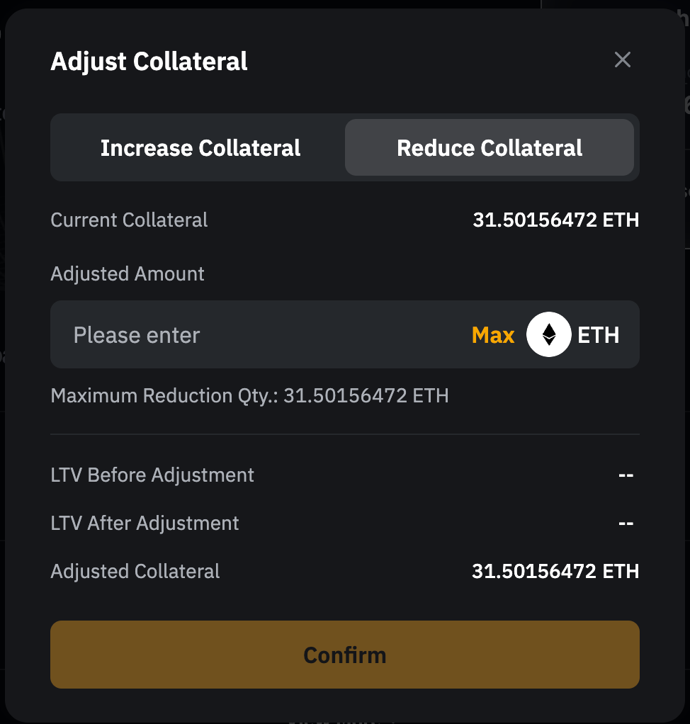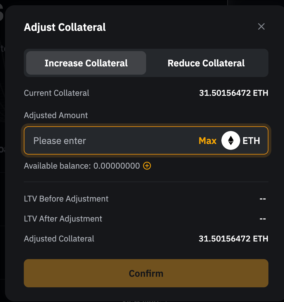 Paso 2: Para ajustar el importe de la garantía, ve a la pestaña Aumentar garantía. Introduce la cantidad que deseas añadir o haz clic en Máx para utilizar todo el saldo disponible en tu cuenta de fondos. Añadir garantías reduce el LTV y disminuye tu riesgo de liquidación.