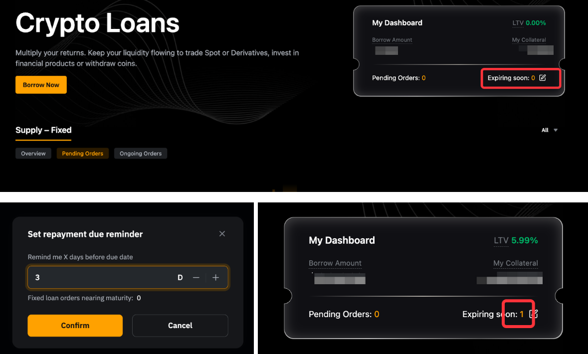 — También puedes habilitar un recordatorio de “pago pendiente” en la página de inicio del Préstamo cripto y haciendo clic en el icono de edición junto a Caduca pronto en Mi panel para establecer el número de días antes de la fecha de vencimiento. Una vez que venza un reembolso, el número de productos que vencen se mostrará junto a Caduca pronto.