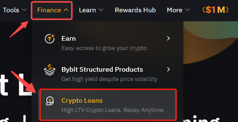 Paso 1: Inicia sesión en el sitio web de Bybit y haz clic en Finanzas → Préstamos cripto en la barra de navegación para acceder a la página Préstamos cripto.