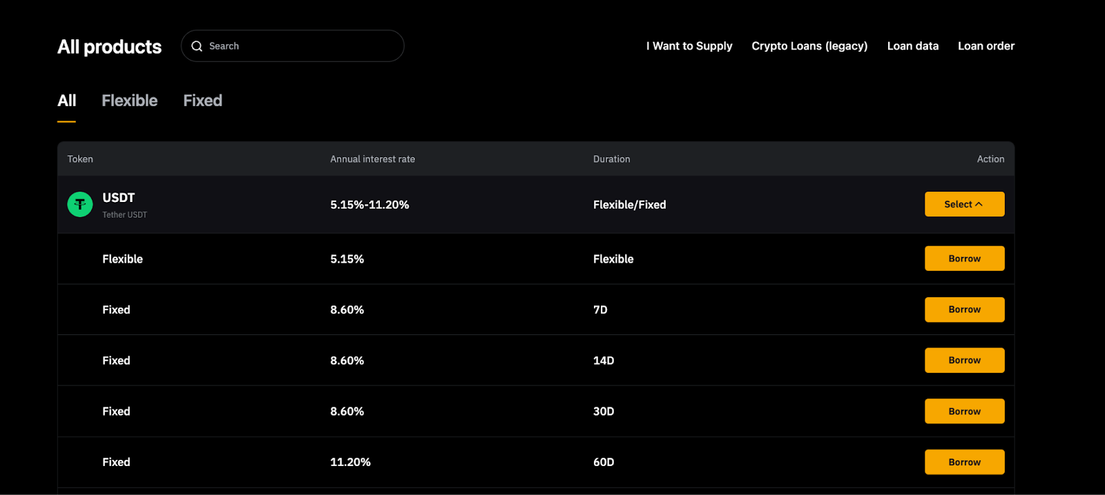 Paso 2: En Todos los productos, encontrarás opciones de préstamos a tasa fija y flexible. Selecciona o busca el activo que quieres pedir prestado para ver las duraciones disponibles y las tasas de interés correspondientes. Haz clic en Pedir prestado en la opción que más te convenga.