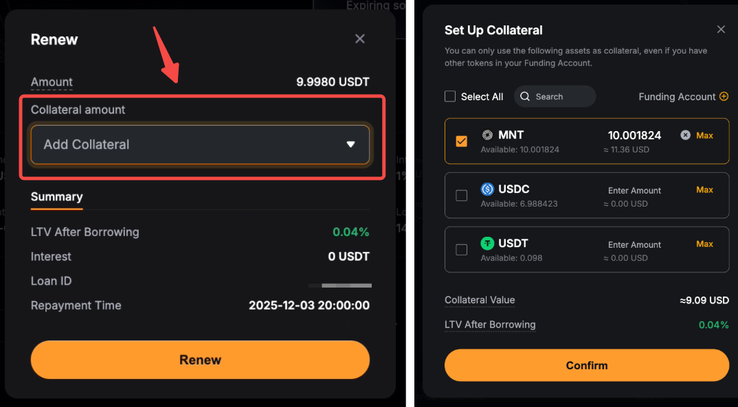 Paso 2: Establezca su depósito de garantía para el préstamo de renovación y revise la LTV y la fecha de vencimiento del pago. Haga clic en Renovar para confirmar la renovación.