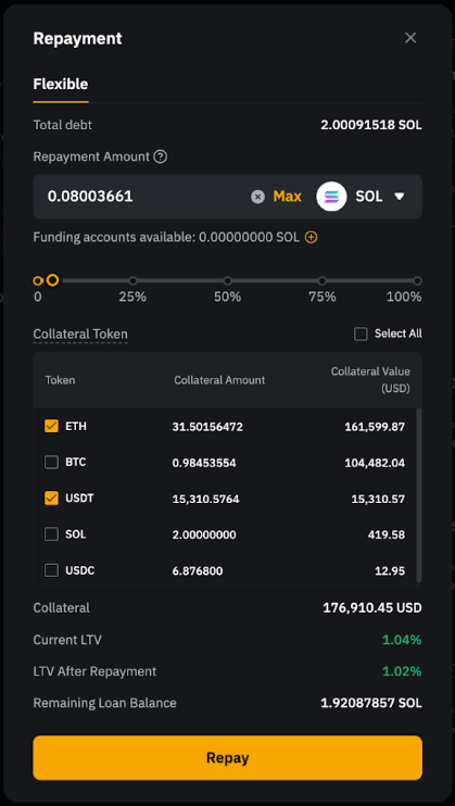 Además, también puede seleccionar más de un tipo de colateral para la devolución. Revise los detalles de la devolución en la ventana emergente de confirmación y pulse Devolver. Se aplicará una comisión si devuelve su Préstamo de Cripto utilizando monedas de colateral. La tasa de la comisión es la más alta entre las tasas de comisión de devolución del activo de colateral y del activo de deuda. La tasa de conversión se calculará en función de los precios del índice tanto del activo de colateral como del activo de deuda.