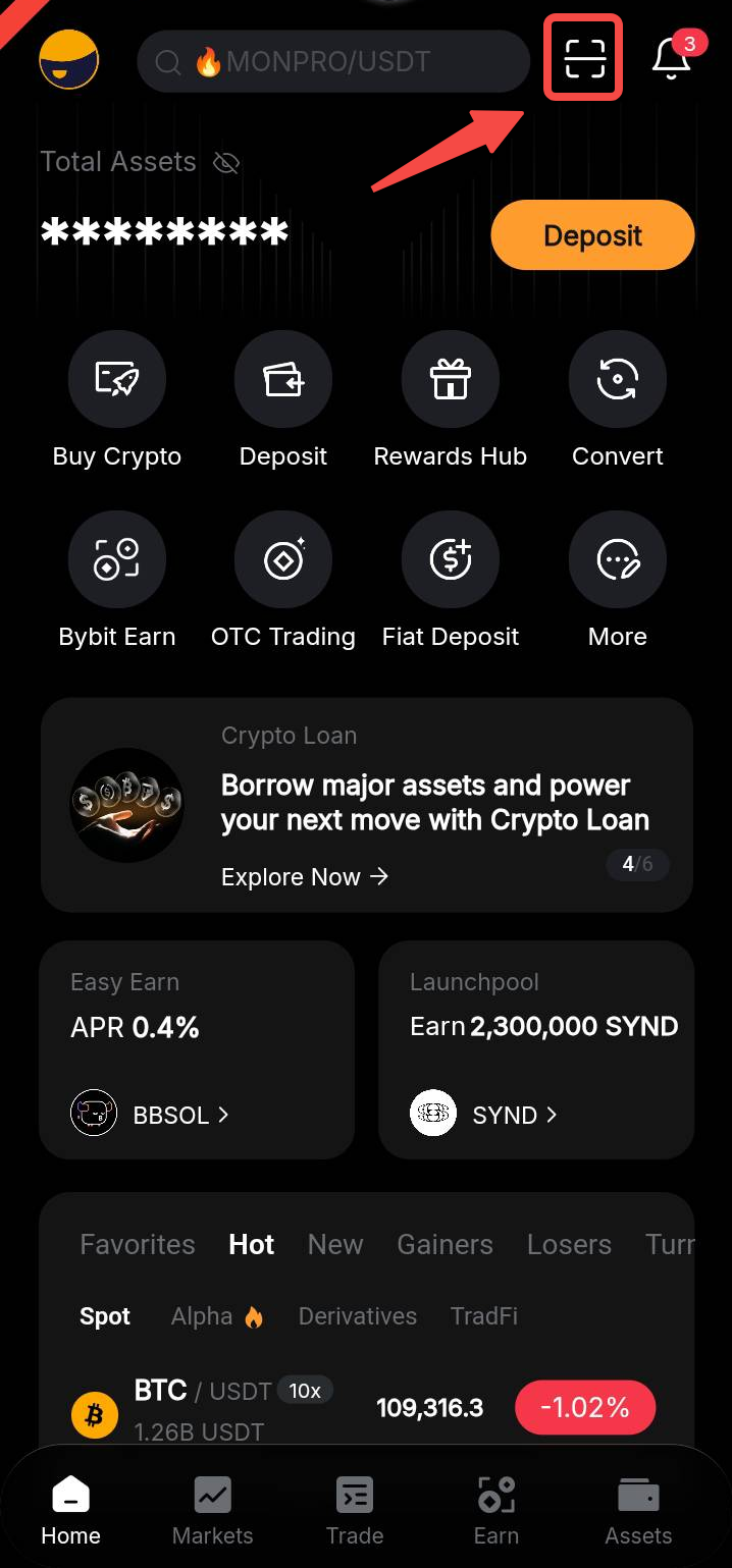 Paso 2: Inicie la aplicación Bybit y toque el icono del escáner de código QR en la esquina superior derecha. Asegúrese de haber iniciado sesión en su aplicación Bybit.