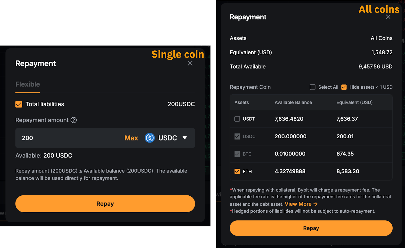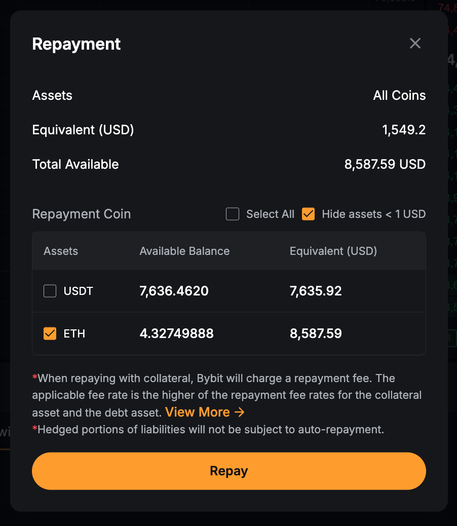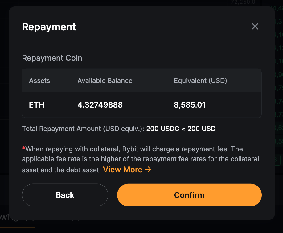 Tras la confirmación, el sistema utilizará primero su moneda en préstamo disponible para el pago. Cualquier pasivo restante se reembolsará convirtiendo los activos colaterales a la moneda prestada. Si el reembolso requiere conversión, Bybit cobrará una comisión de gestión sobre el importe total del reembolso. La tasa de la comisión es la más alta de las tasas de comisión de reembolso para el activo de garantía y el activo de deuda.