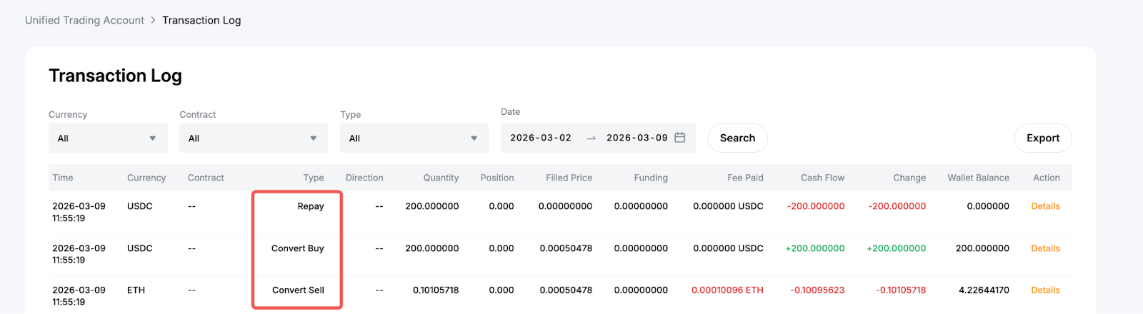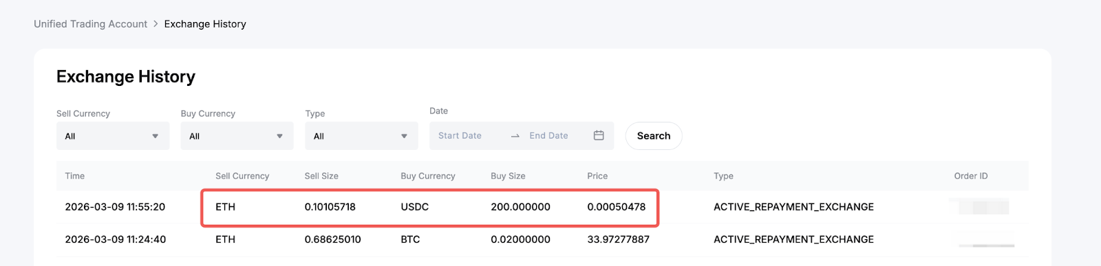 En su Registro de transacciones, puede encontrar detalles para cada pago en los tipos de transacción Convert iry Pagar, enumerados secuencialmente con sellos de hora e ID de pedido idénticos. Las transacciones de conversión indican cualquier conversión automática de activos garantizados seleccionados para pagar el monto del préstamo. Solo aparecerá si usted tiene una moneda en préstamo insuficiente en su saldo para el pago, y las conversiones son necesarias. Mientras tanto, las transacciones de pago muestran el monto que usted pagó por su moneda en préstamo.