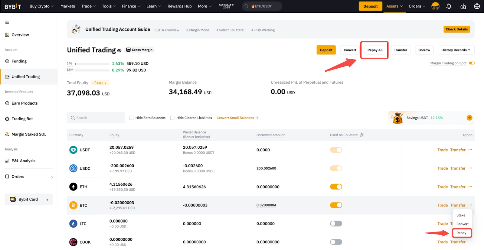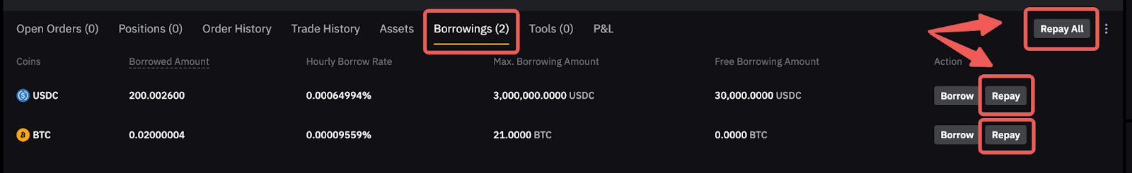 2. Para pagar todas las monedas prestadas, haga clic en Pagar todo en la parte superior de la página de trading unificada.