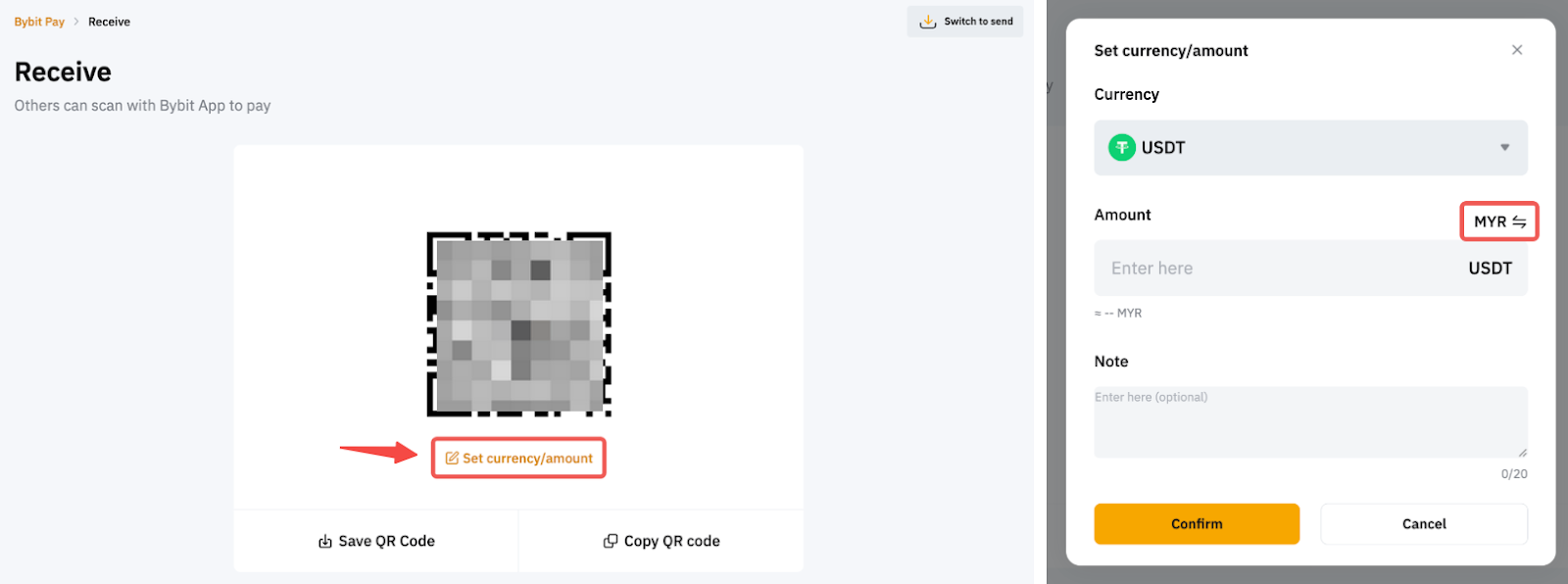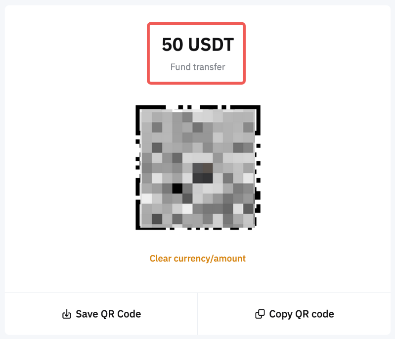 Antes de compartir el código QR, tiene la opción de establecer el tipo de criptomoneda, el importe de la transacción e incluir una nota. Además, puede hacer clic en el icono Intercambiar para introducir la cantidad de moneda fiduciaria y la cantidad de criptomoneda equivalente se calculará y mostrará automáticamente.