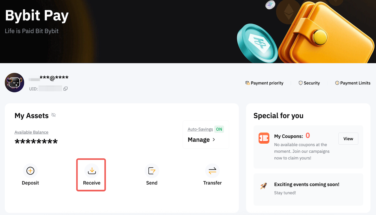 En la página de inicio de Bybit, haga clic en Finanzas → Bybit Pay en la barra de navegación para entrar en la página Bybit Pay. A continuación, haga clic en el botón Recibir para acceder a su código QR.