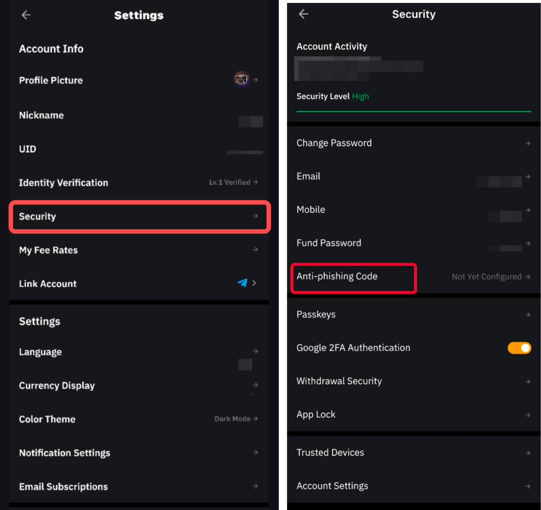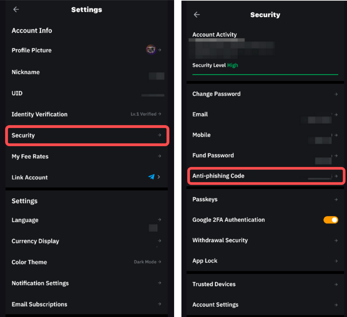 Para modificar tu código anti-phishing actual en Bybit, toca en Seguridady selecciona Código anti-phishing.