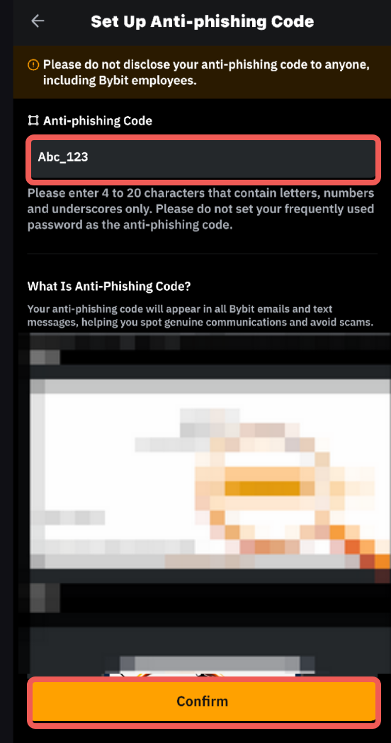 Paso 3: Introduce el código anti-phishing que desees y haz clic en el botón Confirmar.