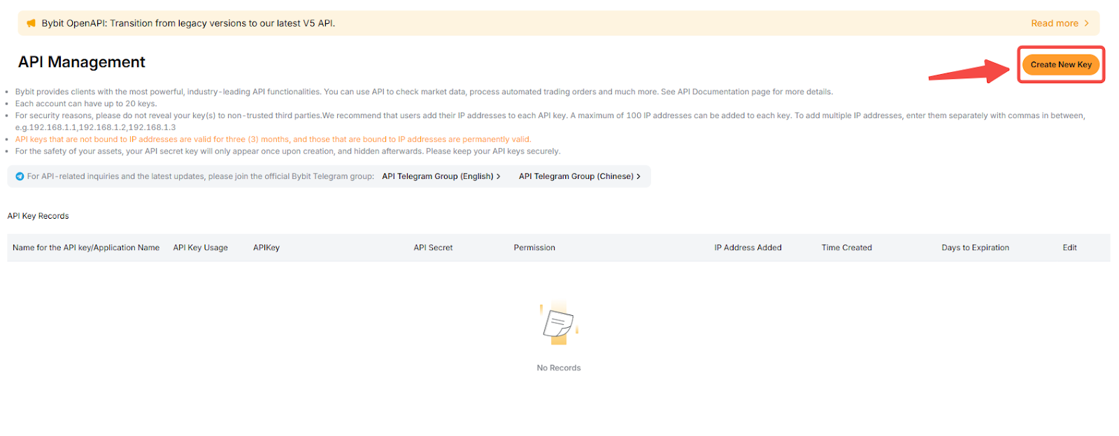 Paso 2: Haga clic en Crear nueva clave. Aparecerá una ventana emergente en la que podrá seleccionar el tipo de clave API que mejor se adapte a sus necesidades de trading.