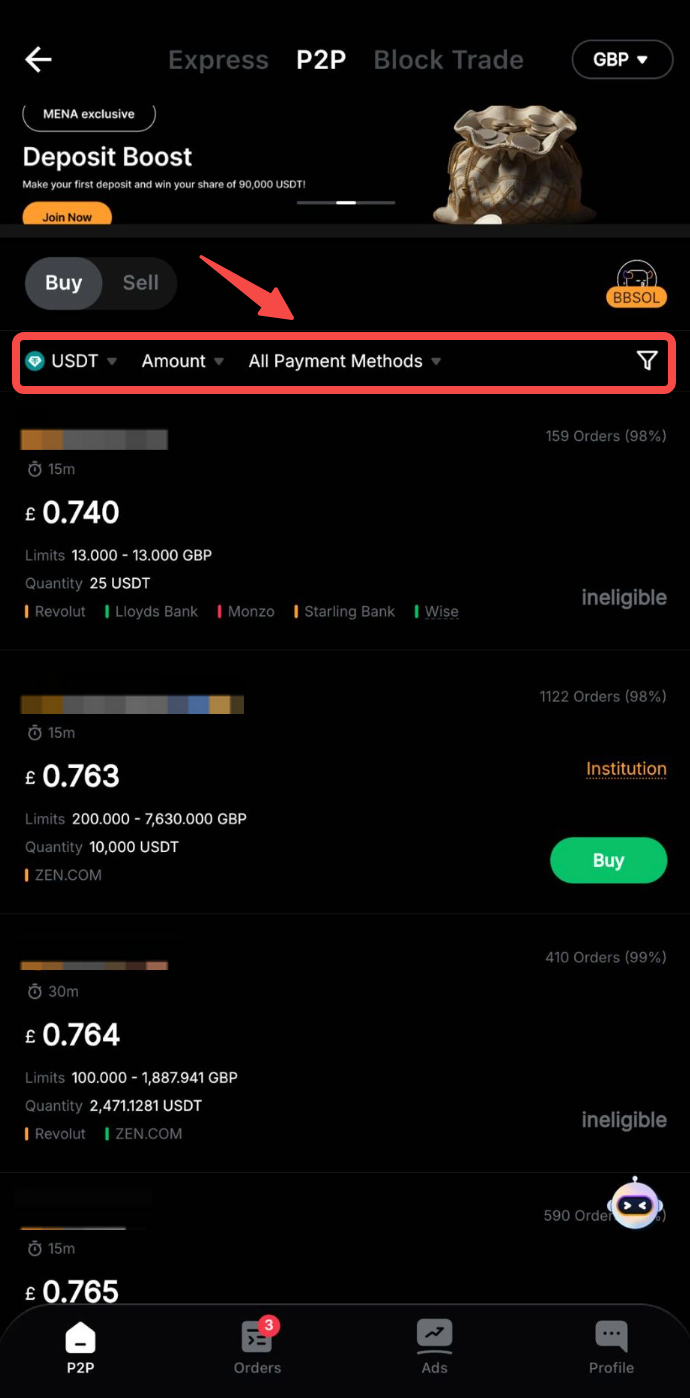 Paso 2: En la página Comprar, puede filtrar anunciantes seleccionando los criterios que desee para Monedas de Fiat o Método de pago: Saldo de Fiat, según los requisitos de su transacción.