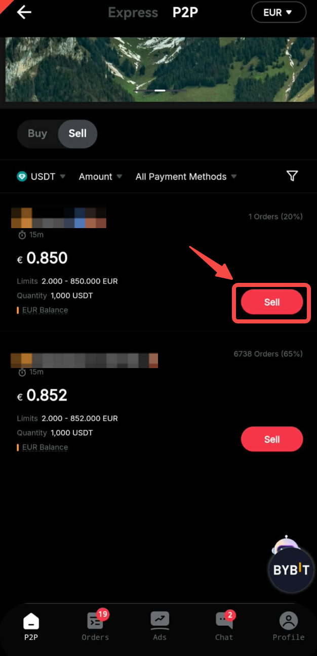 Paso 3: Elija su anunciante preferido y haga clic en Vender. Asegúrese de que el anunciante que elija sea compatible con el método de pago fiat.