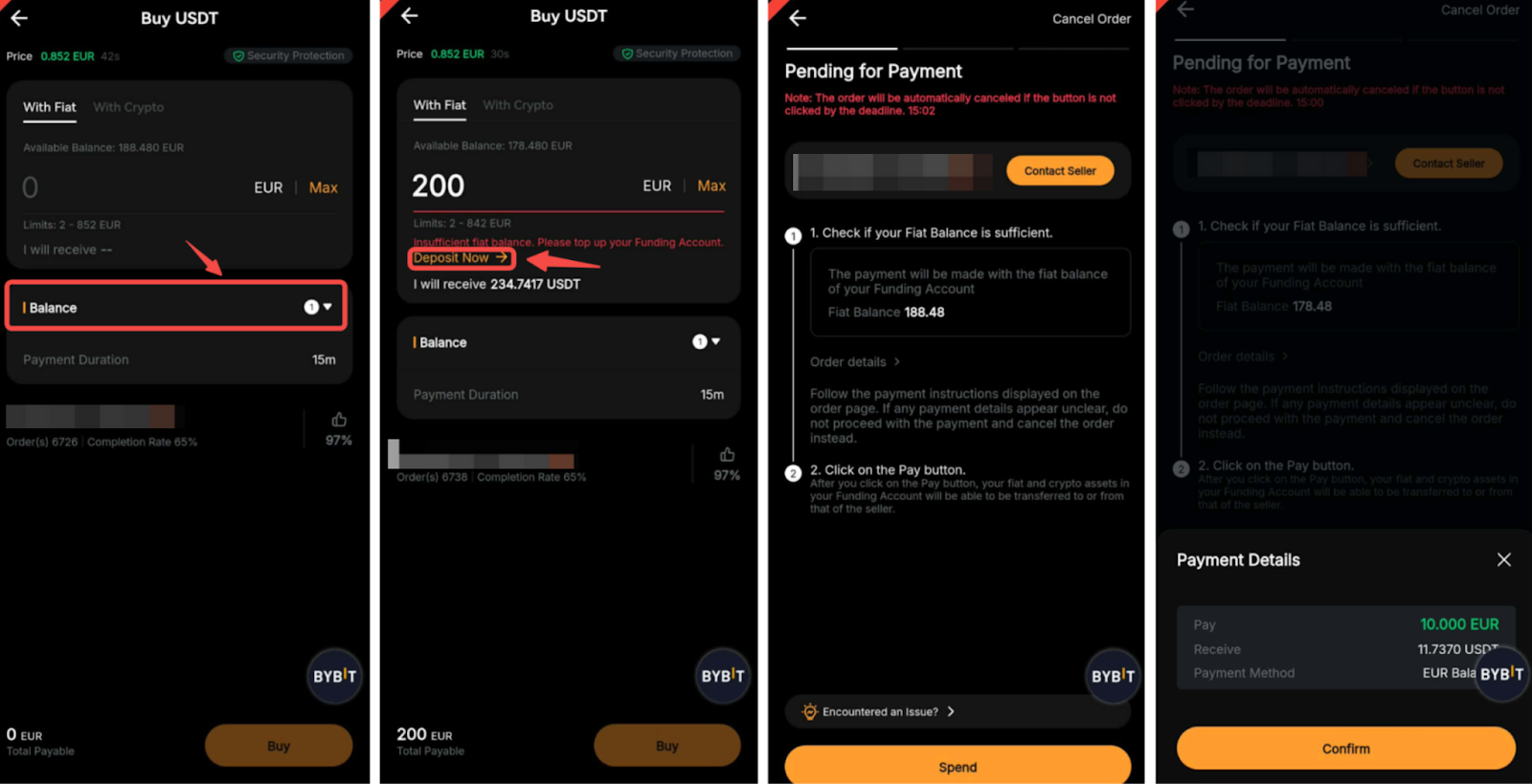 La siguiente guía paso a paso describe cómo completar su primera transacción P2P utilizando su saldo de Fiat en Bybit.