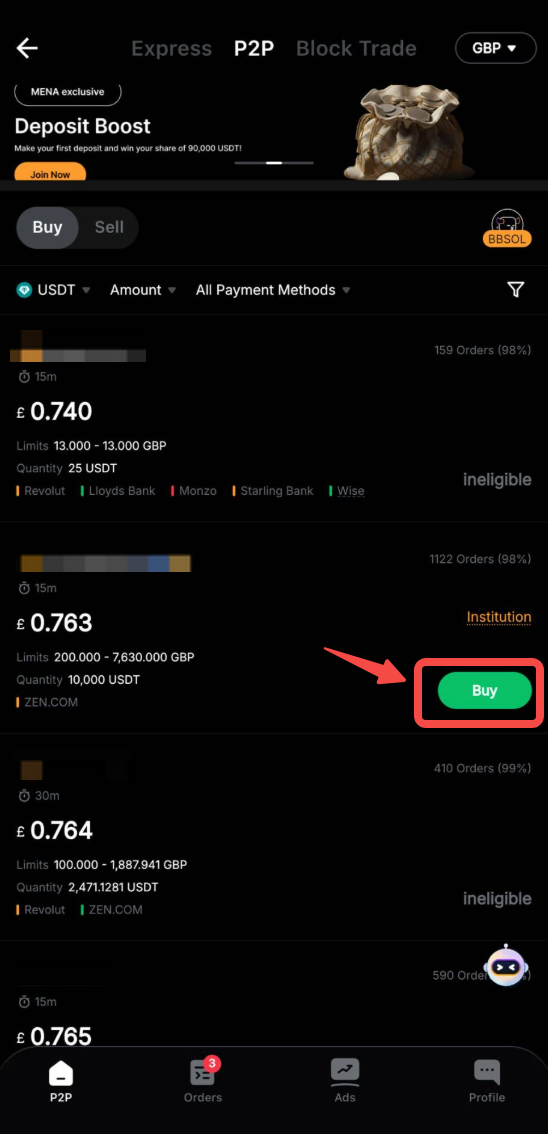 Paso 3: Elija su anunciante preferido y haga clic en Comprar. Asegúrese de que el anunciante que elija admita el pago de Fiat Balance.