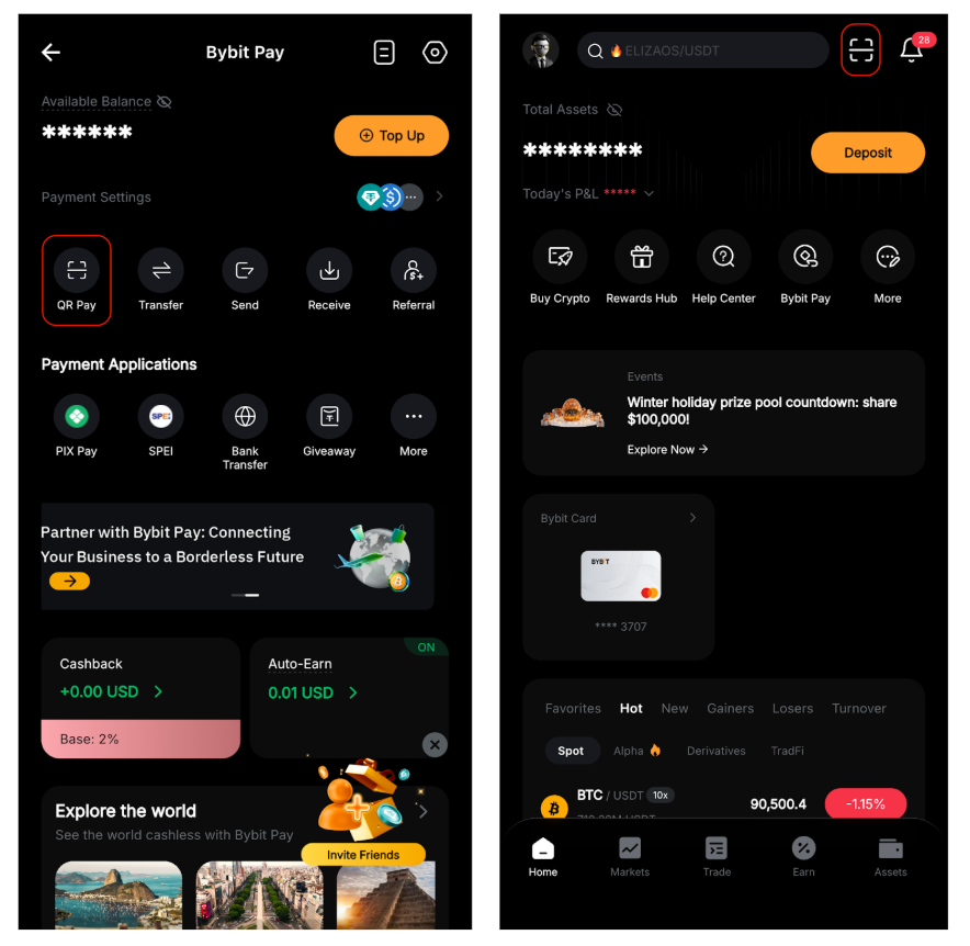 Paso 1: Desde la página de inicio de Bybit, toque en Más → Pago de Bybit → Pago QR para abrir el escáner QR. Como alternativa, pulsa el icono del escáner QR en la página de inicio para empezar a escanear.