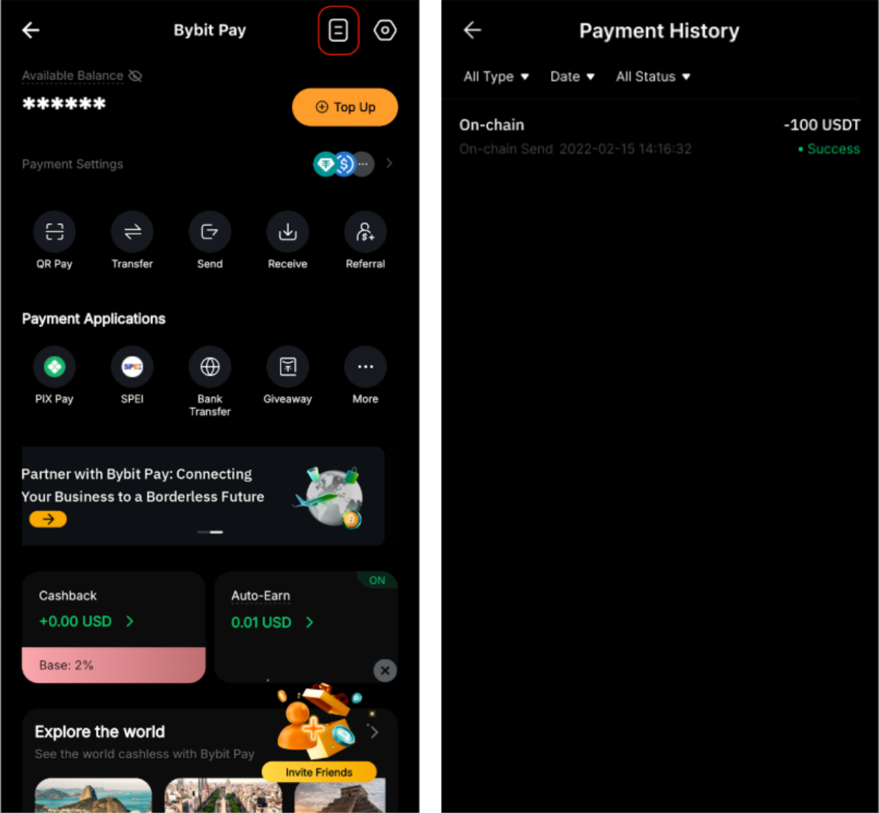 Para ver tu historial de envíos en cadena, ve a la página Bybit Pay y pulsa el icono Historial de pagos en la esquina superior derecha.