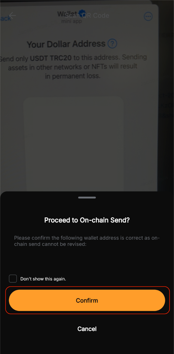 – Confirme que la dirección de la cartera es correcta antes de continuar, ya que las transacciones en cadena son irreversibles una vez enviadas.