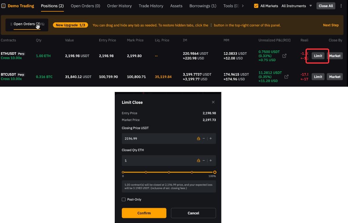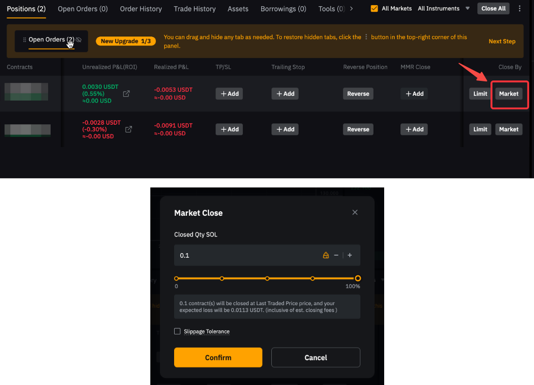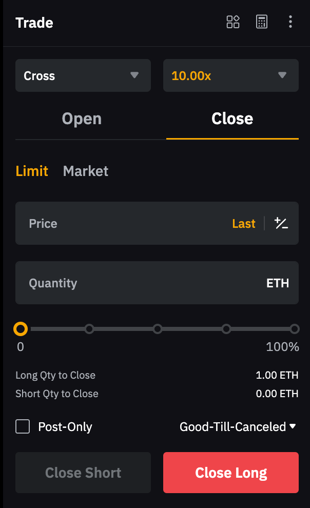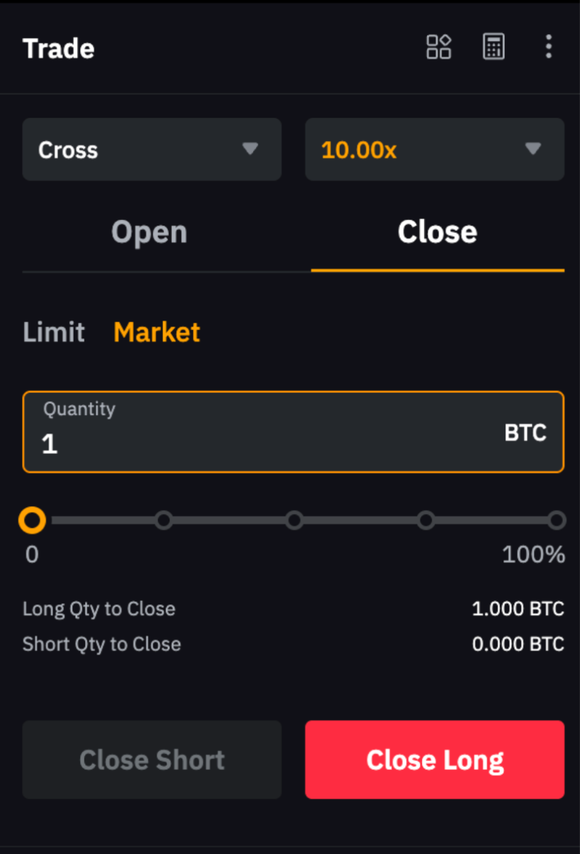 Por ejemplo, para cerrar una posición larga de 1 BTC, coloca una orden de mercado corta de 1 BTC. Ten en cuenta que si la cantidad del pedido supera el tamaño de tu posición actual, se puede abrir una nueva posición en la dirección opuesta.