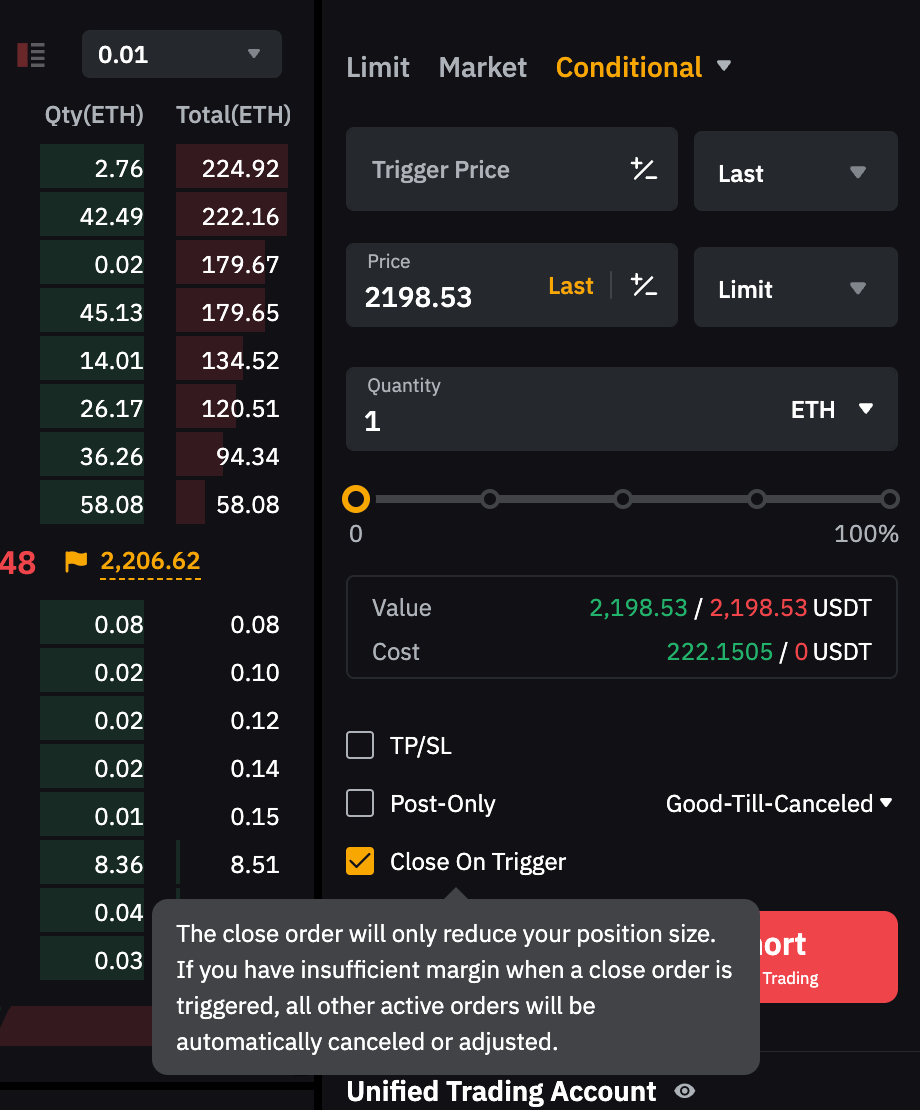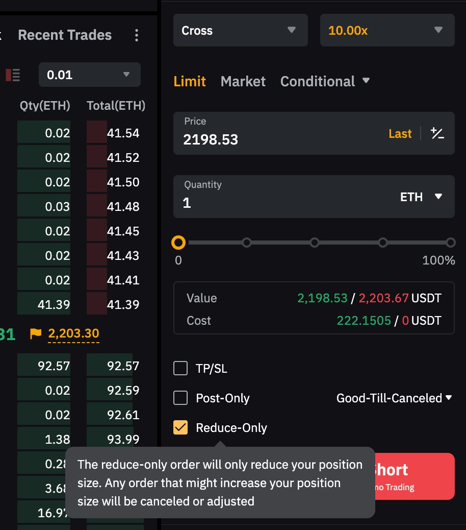 Ten en cuenta: Si la cantidad de la orden supera el tamaño de tu posición actual, se puede abrir una nueva posición en la dirección opuesta. Para evitar esto, puede activar la función de Sólo-Reducir para una orden con límite o Cerrar al activarse para una orden condicional.