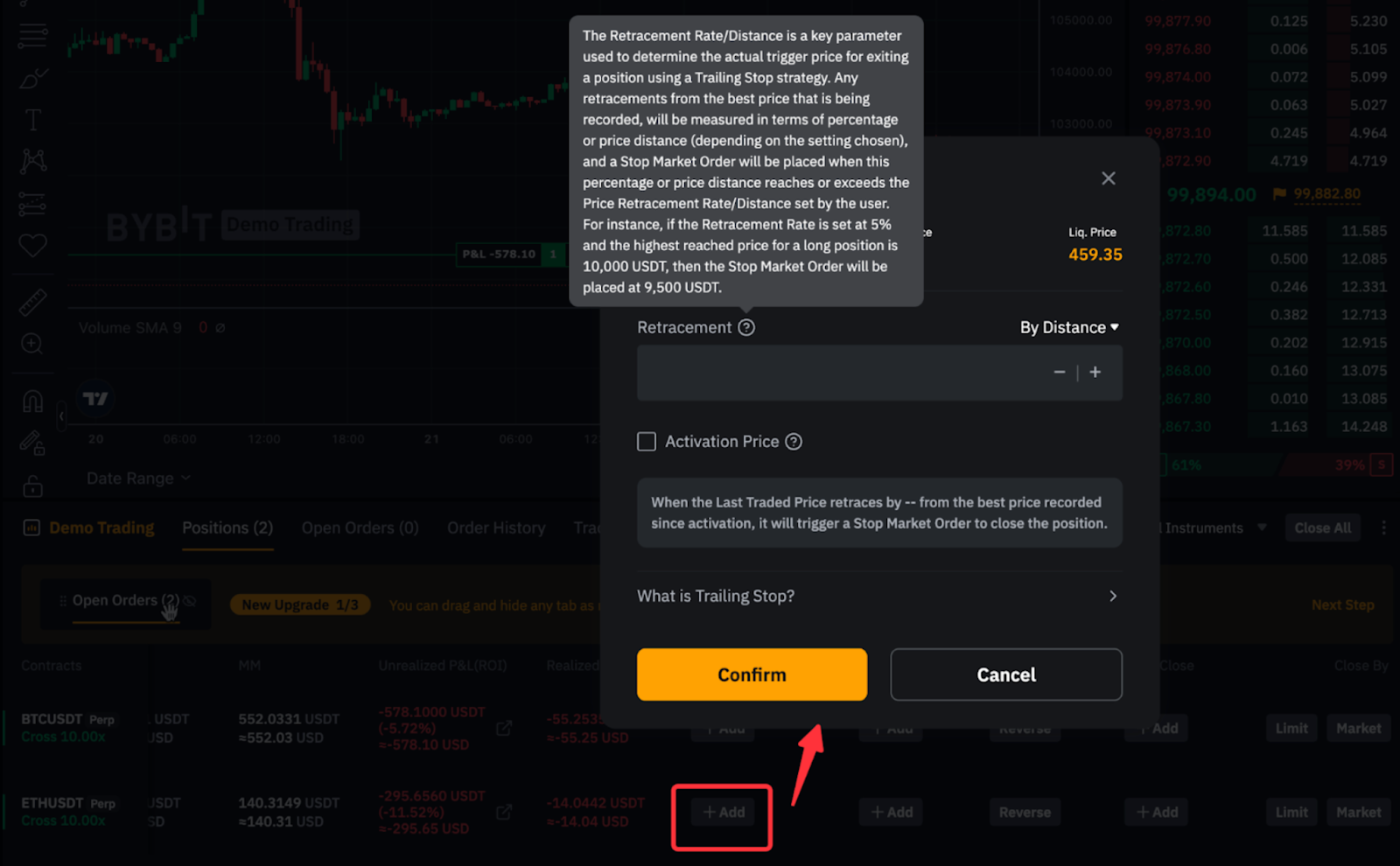 Una orden de Trailing Stop ajusta dinámicamente el precio de stop con los movimientos del mercado, lo que te ayuda a asegurar ganancias y al mismo tiempo limita el riesgo potencial a la baja. Para obtener más detalles, consulta la información sobre Órdenes de Trailing Stop (trading de perpetuos y de futuros).