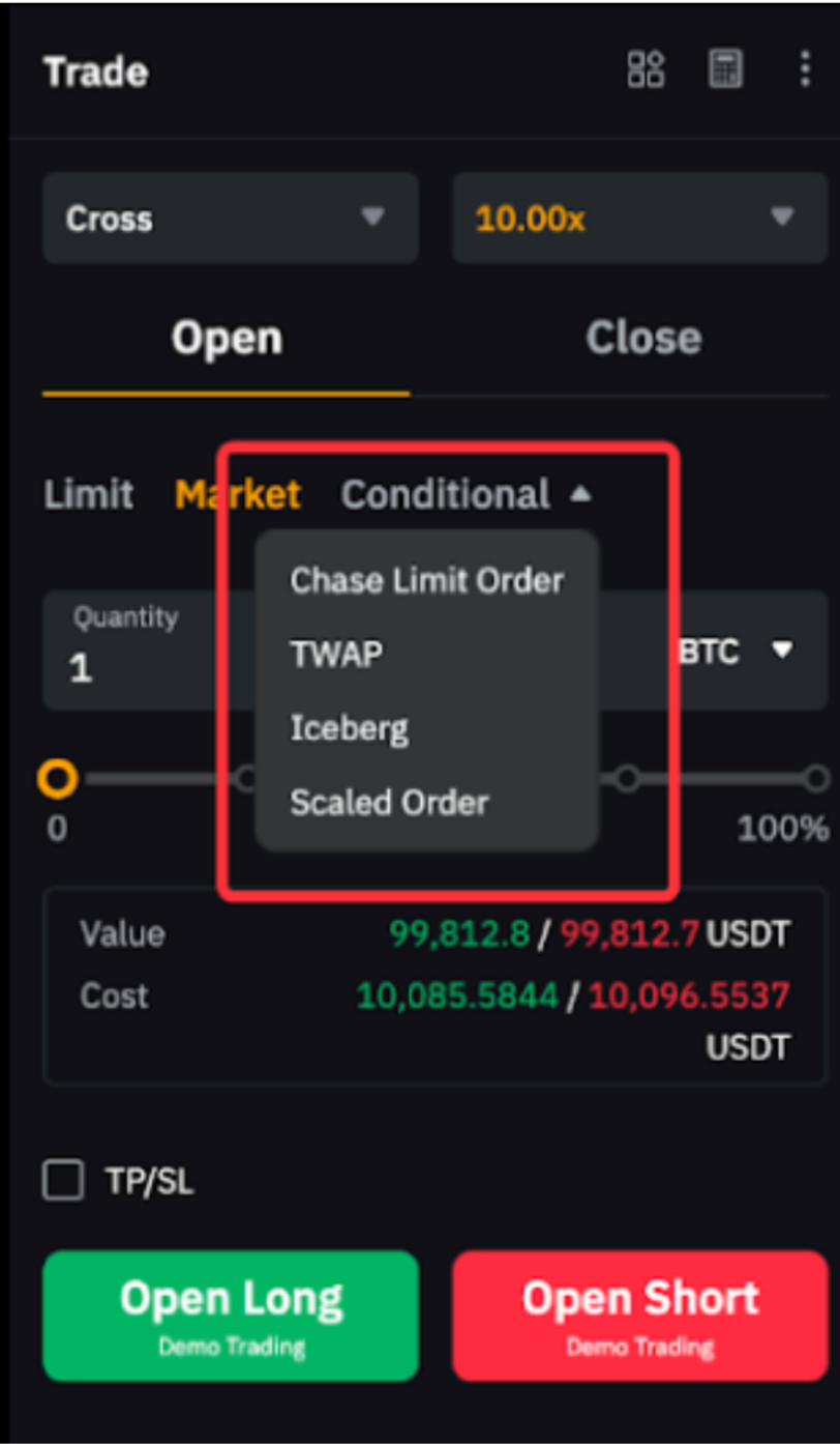 También puedes utilizar herramientas de órdenes avanzadas para cerrar posiciones. Asegúrate de que la opción Sólo-Reducir esté seleccionada para evitar abrir nuevas posiciones involuntariamente. Para obtener más detalles, consulta las guías respectivas: