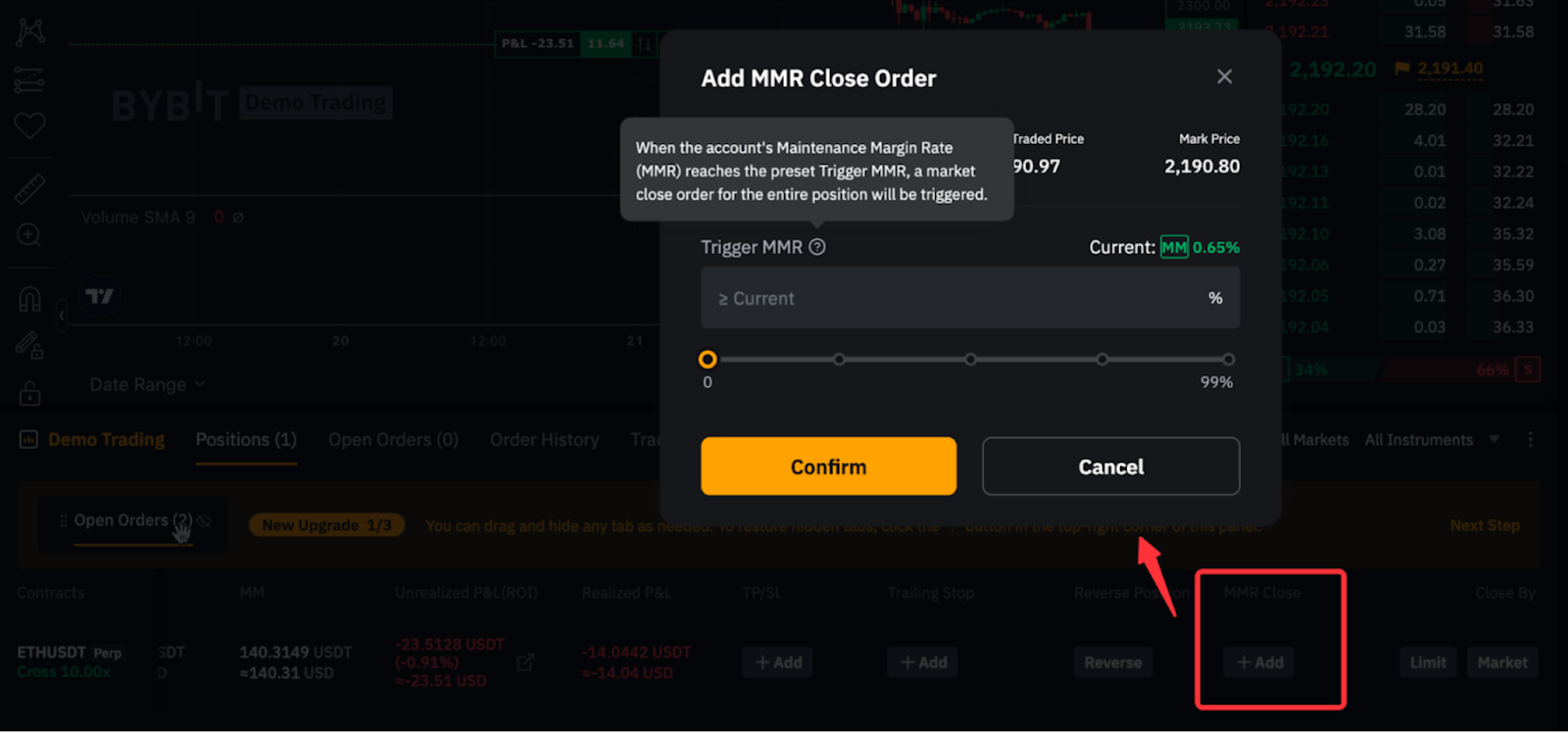 El Cierre por MMR colocará automáticamente una orden de mercado para cerrar por completo la posición seleccionada si la tasa de margen de mantenimiento (MMR) de tu cuenta alcanza el nivel de activación preestablecido. Para obtener más información, consulta la página de Orden de cierre por tasa de margen de mantenimiento (MMR).
