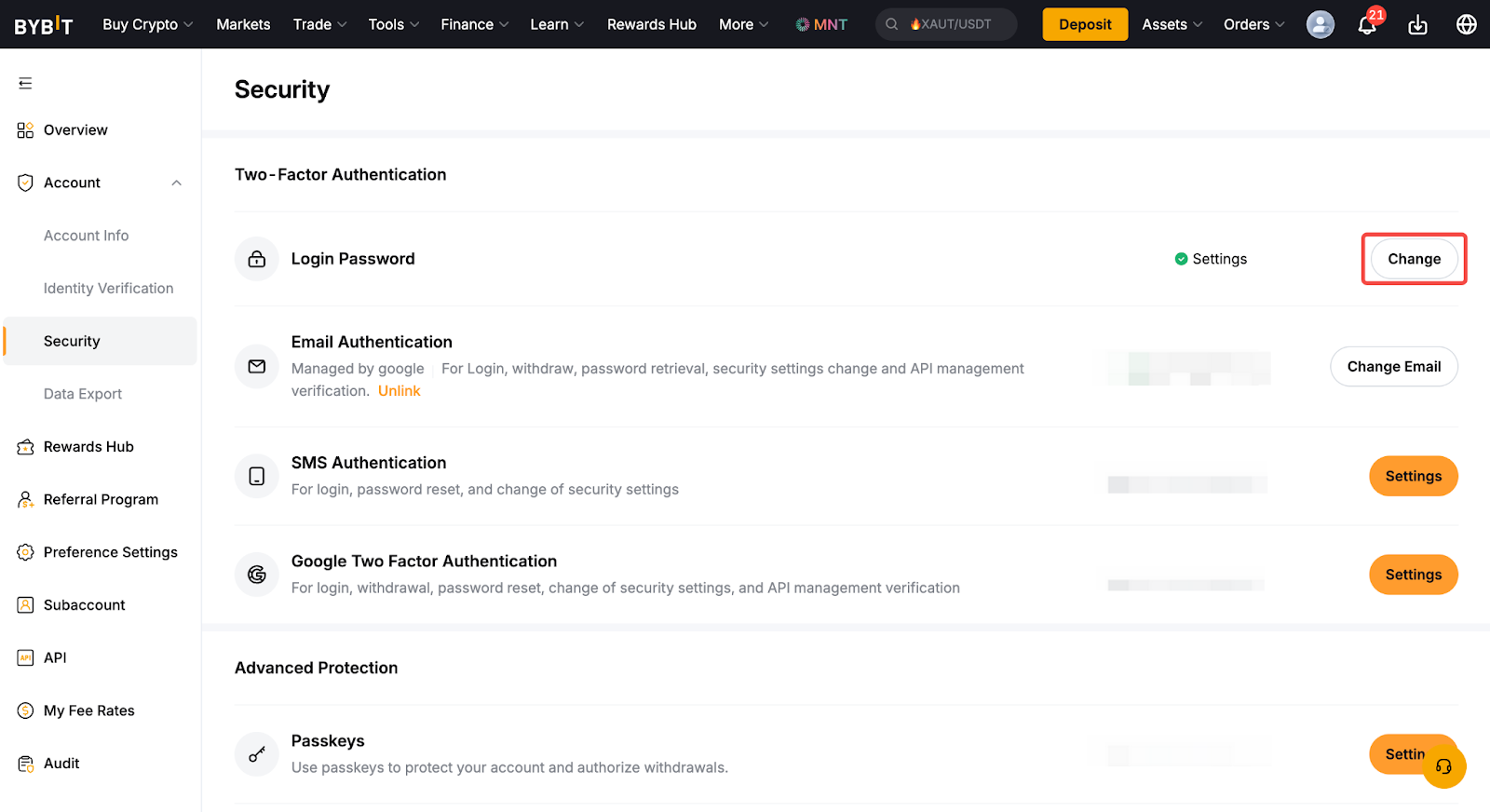 Sin embargo, si inicialmente registró su cuenta de Bybit con su cuenta de Google, puede iniciar sesión directamente haciendo clic en el icono de Google en la página de inicio de sesión. A continuación, haga clic en su Icono de perfil → Seguridad → Cambiar contraseña para restablecer su contraseña.