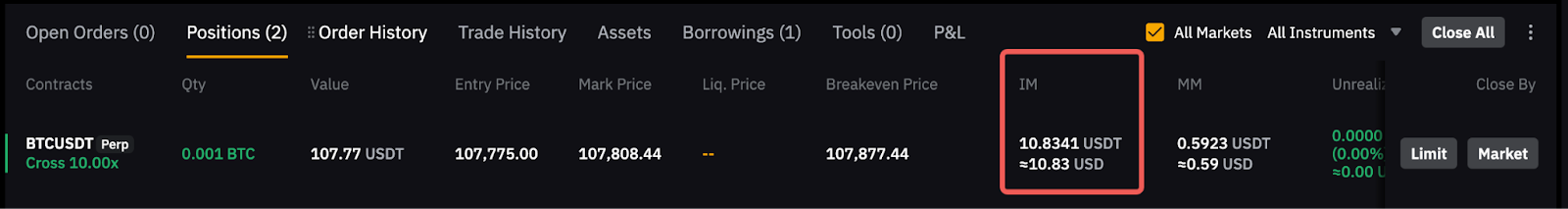 Ten en cuenta que el margen inicial que se muestra en la pestaña de posición incluye la tarifa de taker, en la que se puede incurrir al cerrar la posición.