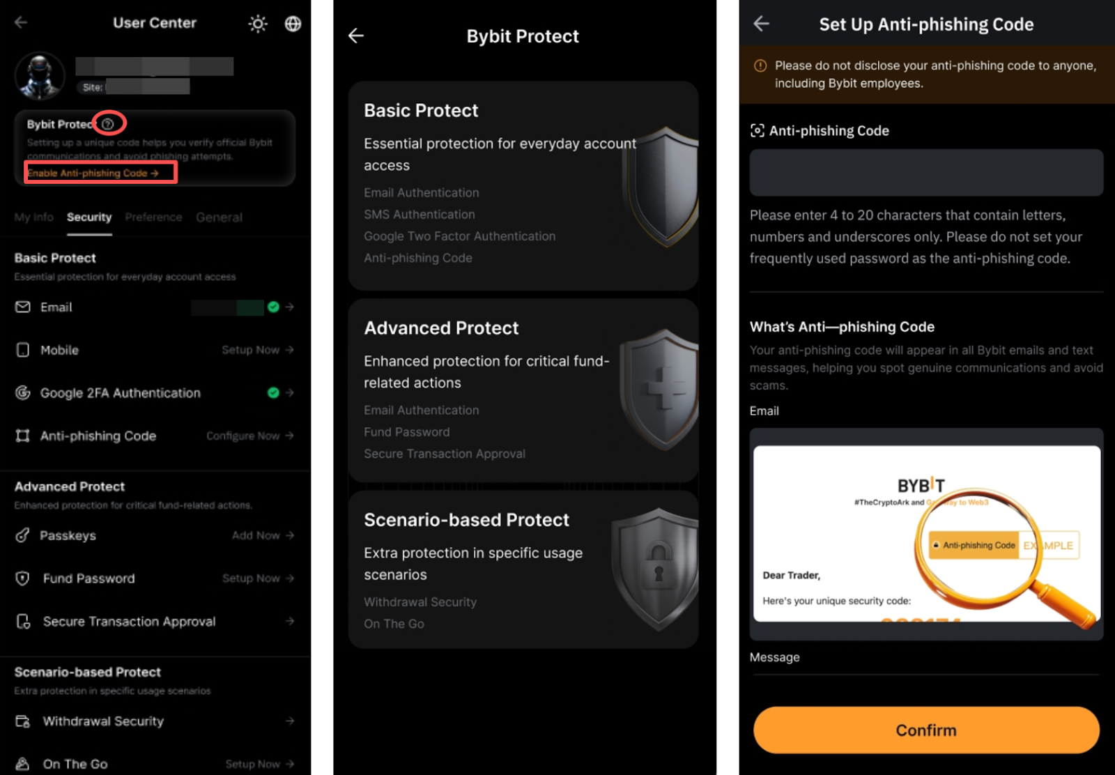 2. Comprueba siempre el código antiphishing en los correos electrónicos o mensajes SMS de Bybit para asegurarte de que el mensaje es legítimo.