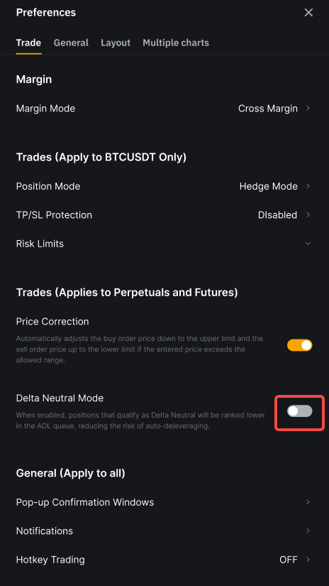 Paso 3: En la pestaña Trade, active el interruptor del Modo Delta Neutral.
