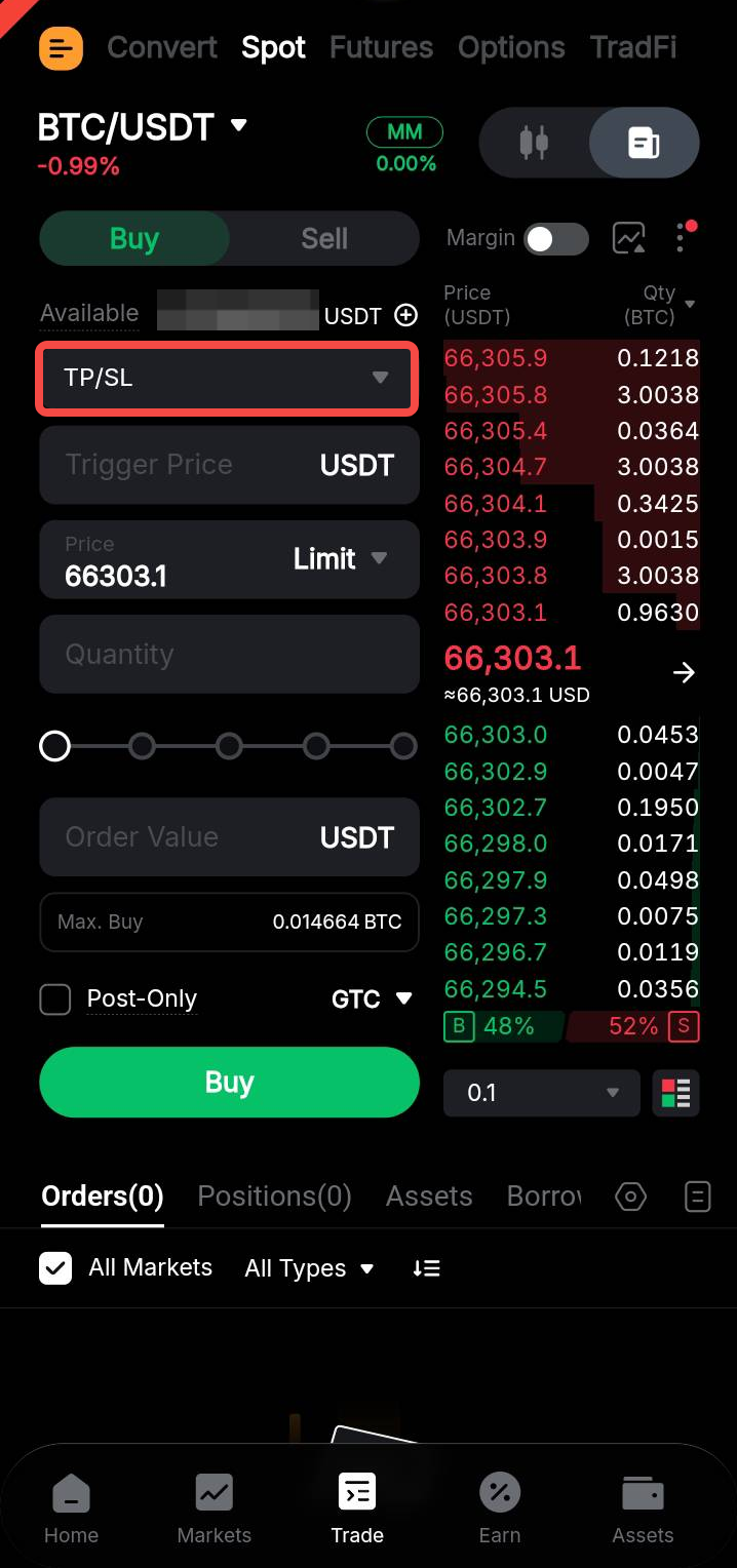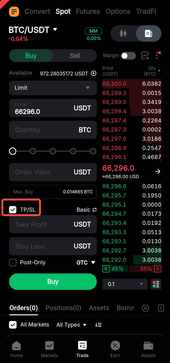 Además de configurar una orden límite, los traders tienen la opción de incluir un conjunto de órdenes TP o SL. Una vez ejecutada la orden límite, las órdenes TP y SL se envían automáticamente en función de los precios preestablecidos y la cantidad de la orden especificada.