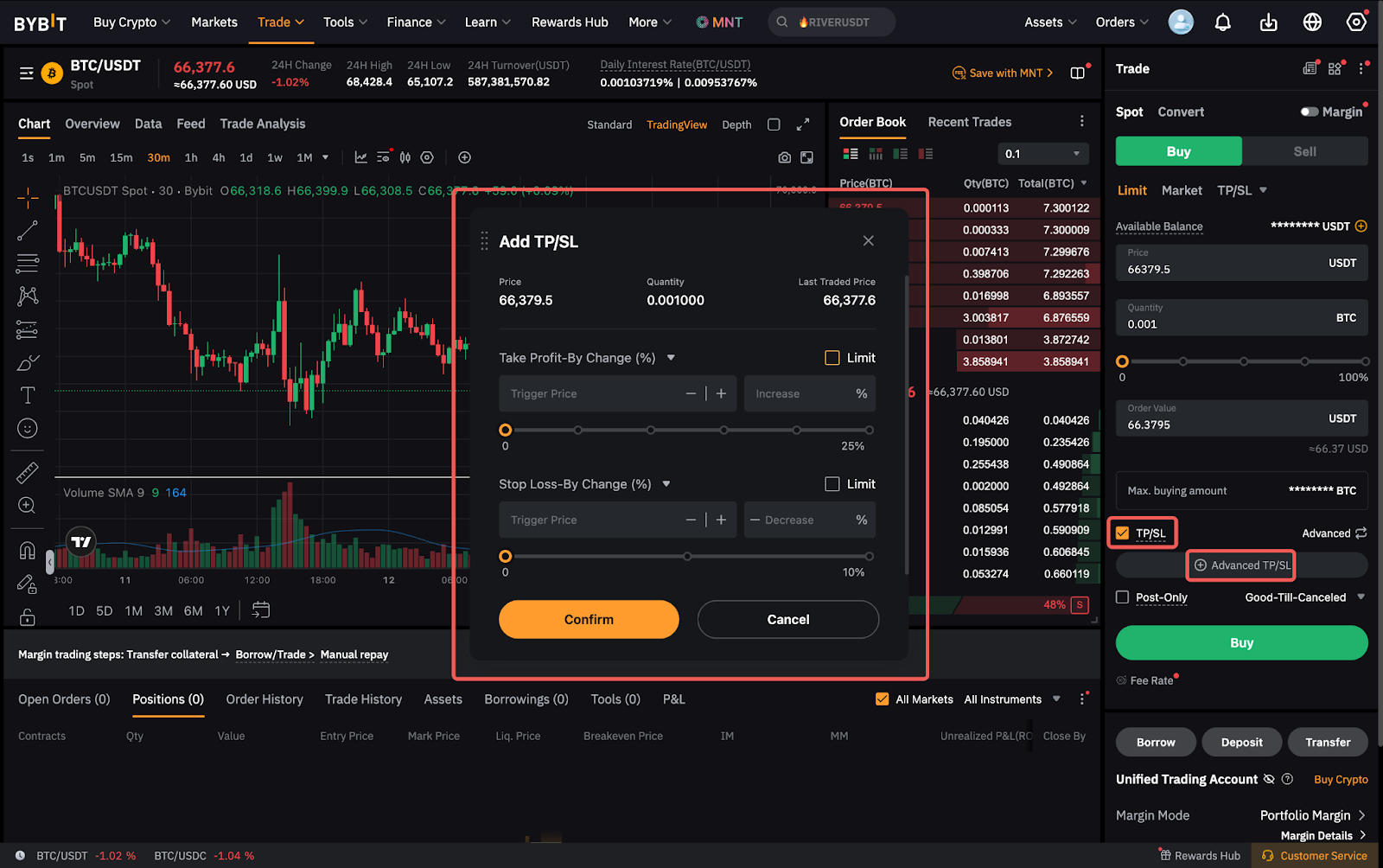 — Para la orden de venta TP/SL vinculada a tu orden de compra con límite en spot, el precio de activación TP debe ser superior al precio de tu orden límite, mientras que el precio de activación SL debe ser inferior al precio de tu orden límite.