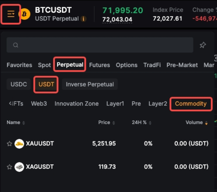 En la página de trading de futuros, abre el menú desplegable de símbolos en la esquina superior izquierda y ve a Perpetuo USDT Materia prima (Commodity).