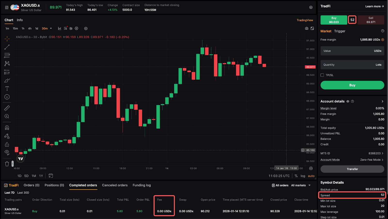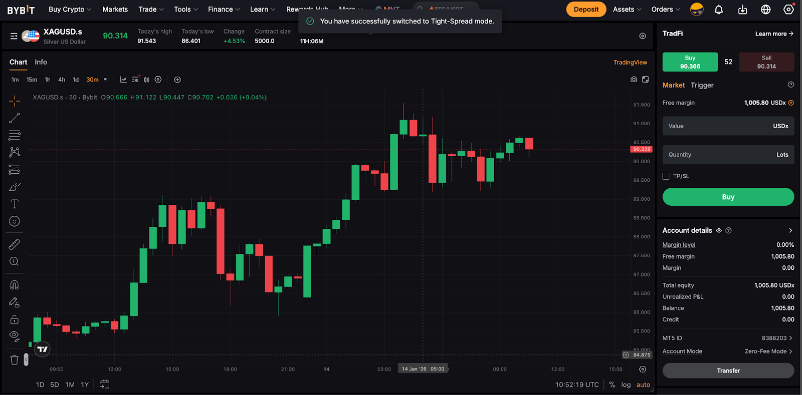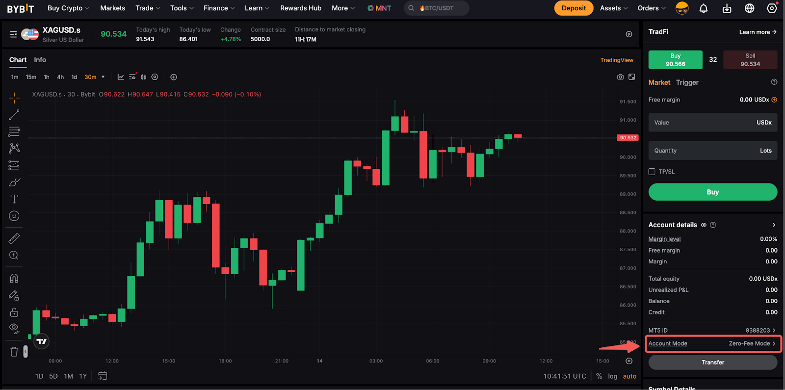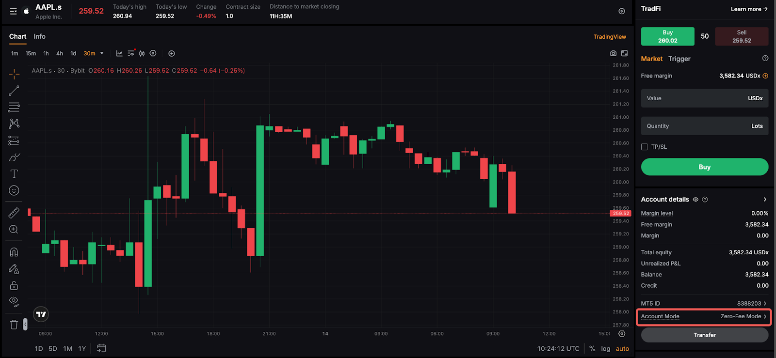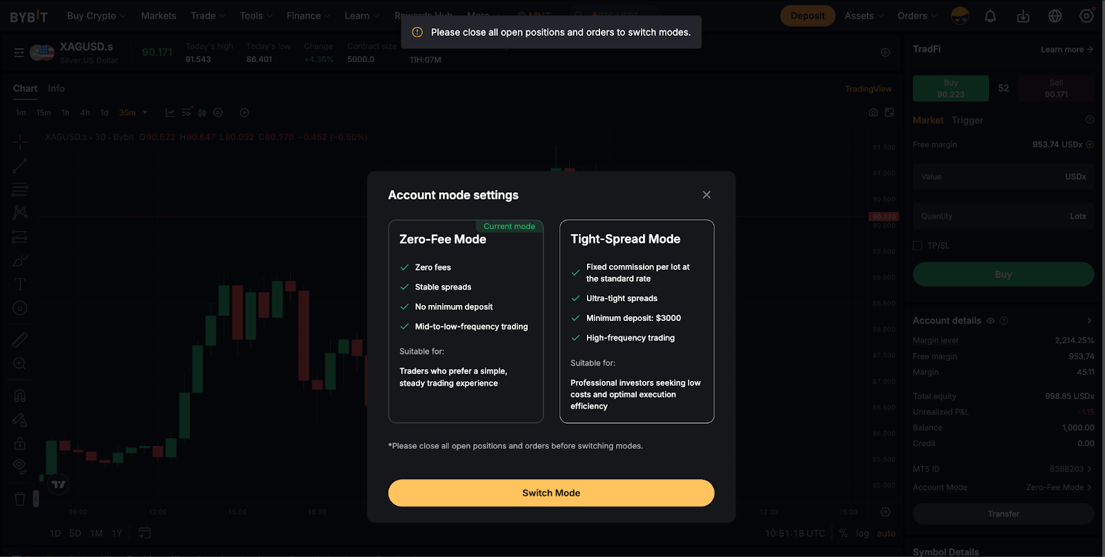 De forma predeterminada, la interfaz de negociación TradFi del usuario está configurada en modo de cero carga, mientras que el modo de dispersión ajustada solo se puede habilitar cumpliendo requisitos específicos. Los usuarios pueden determinar el modo de cuenta actual para su cuenta TradFi marcando la sección Modo de cuenta en Detalles de cuenta.