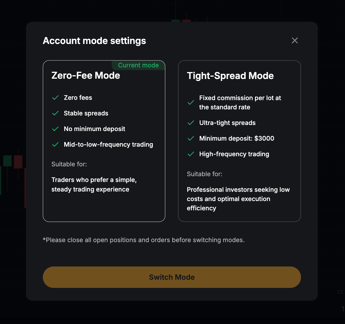El modo Zero-Fee se asigna automáticamente a todos los usuarios. Proporciona precios simples y diferenciales estables sin comisiones separadas.
