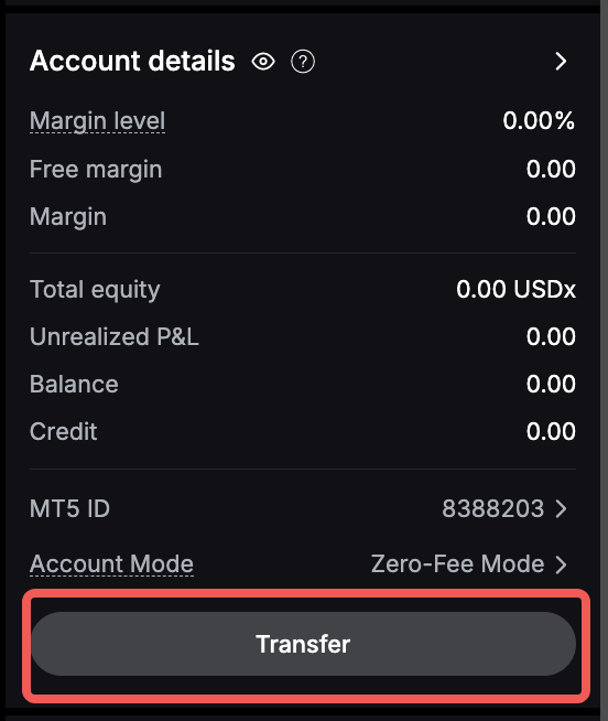2. Si no ha cumplido con el requisito de depósito, haga clic en el botón Transferir en Detalles de cuentas y realice la transferencia necesaria a su cuenta TradFi.