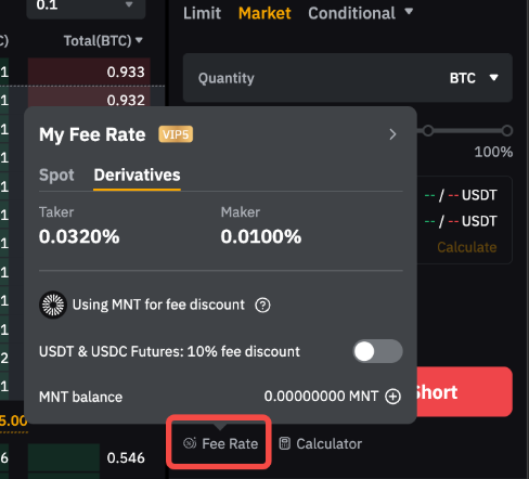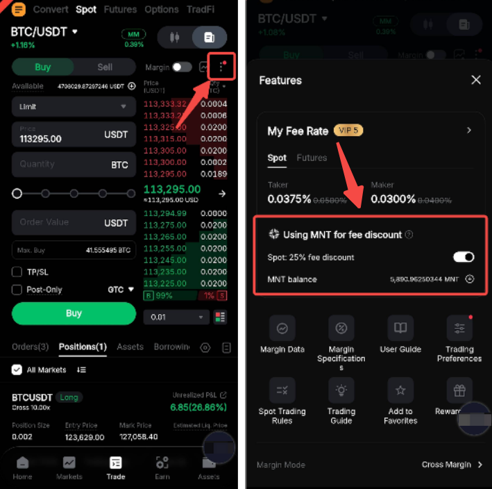 Supongamos que eres un usuario VIP 4 con una tasa de taker del 0,0600 %. Comprar 10 BTC en Spot con una orden de mercado normalmente costaría 0,006 BTC en tarifas. Al pagar con MNT, la tarifa se reduce en un 25% a 0,0045 BTC en MNT. Para obtener más detalles, consulta las preguntas frecuentes: Pago de tarifas de trading con MNT.