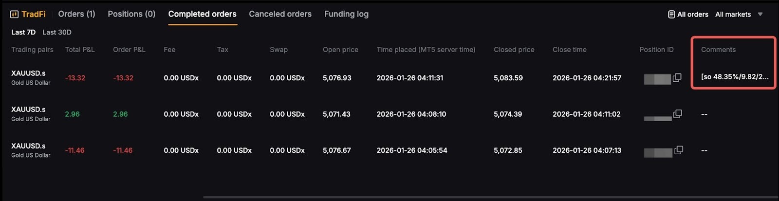 Cuando el cierre de margen se active en MT5, se mostrará de la siguiente manera en la pestaña Orden completada.