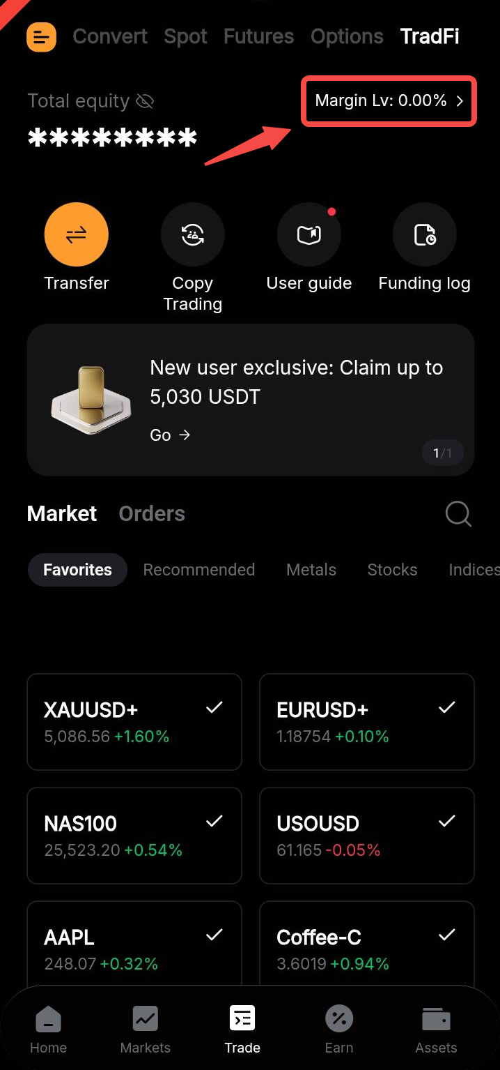 El nivel de margen para TradFi en la aplicación móvil de Bybit se puede encontrar en la pestaña Trades que se muestra a continuación.
