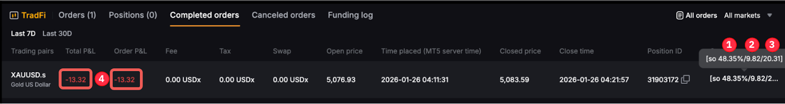 Para los traders con múltiples posiciones abiertas, TradFi cerrará posición(es) en función de “La pérdida más grande primero” durante un cierre de margen. Si el nivel de margen alcanza o cae por debajo del 50 %, la posición con las mayores pérdidas se cerrará primero al precio de mercado (licitar/solicitar), seguido del siguiente mayor, y así sucesivamente hasta que el % del nivel de margen vuelva a superar la cantidad mínima requerida. Esto se hace para proteger a los traders de incurrir en más pérdidas.
