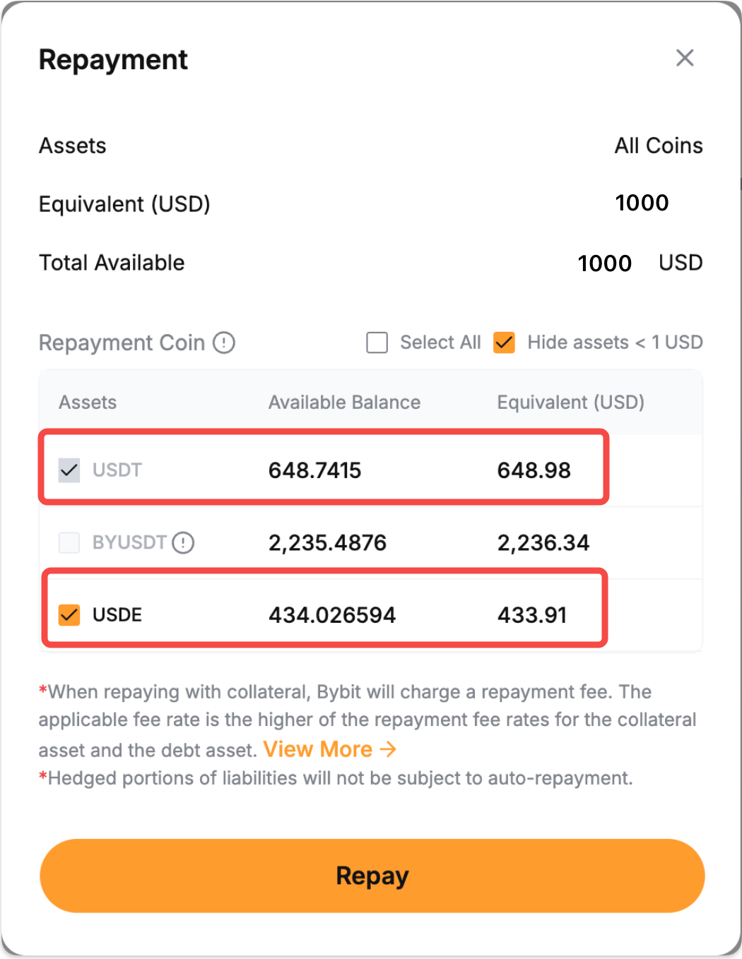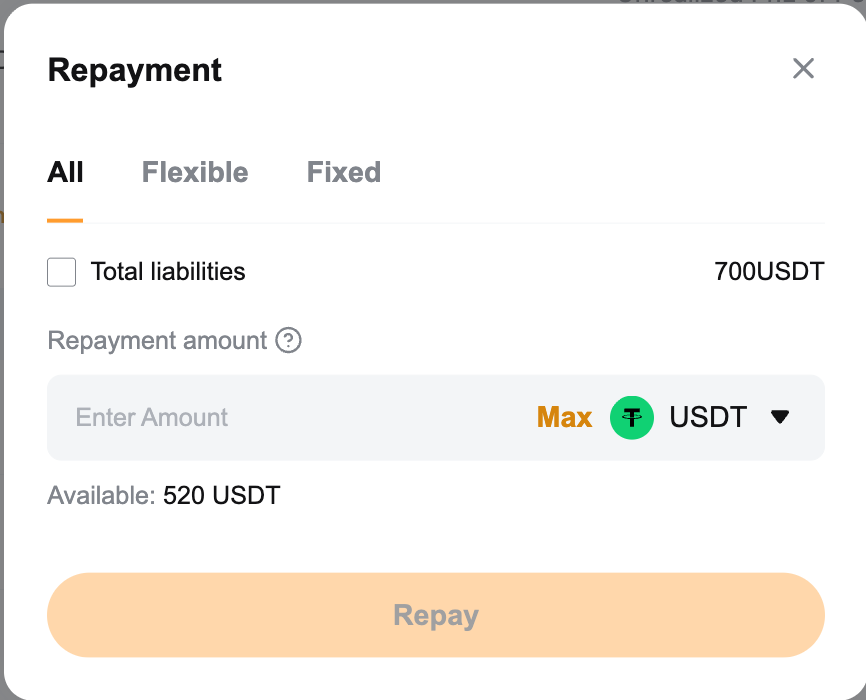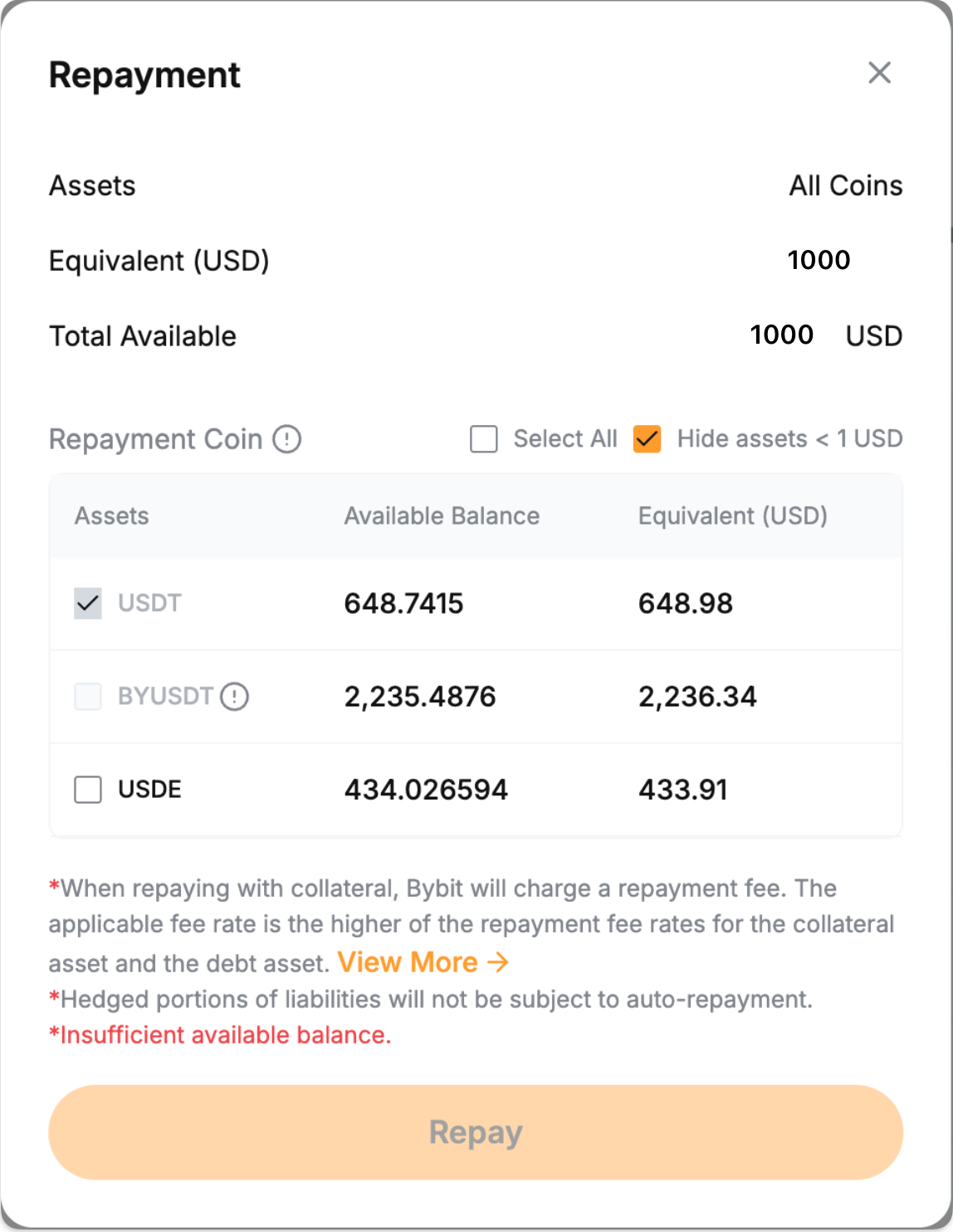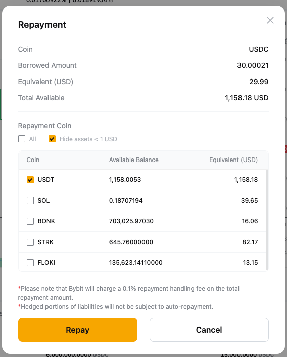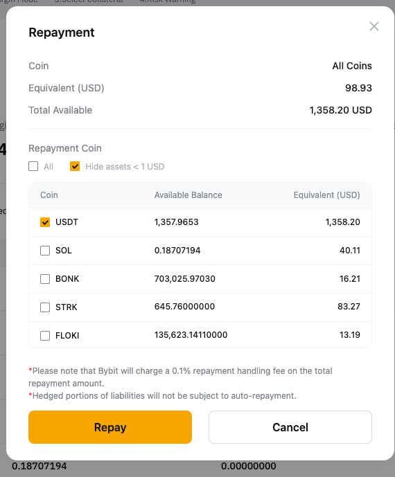 Paso 2: El sistema utilizará primero su moneda prestada disponible para el pago. Cualquier monto restante estará cubierto convirtiendo su colateral en la moneda prestada.