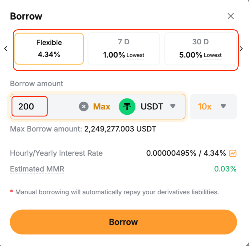 Paso 2: Seleccione el tipo de préstamo (Flexible o Fijo) e ingrese el monto. Haga clic en Pedir prestado para confirmar.
