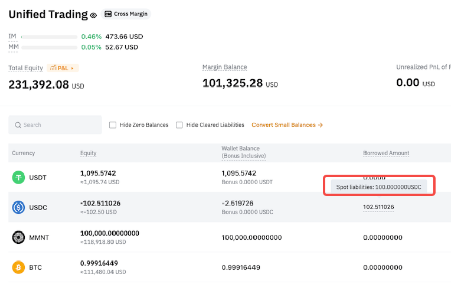Antes de la actualización, todos los pasivos de la cuenta de operaciones unificadas se trataban como un único saldo combinado. Después de la actualización, se separarán en pasivos al contado y pasivos derivados. Esta distinción afecta la forma en que se gestionan los pagos.