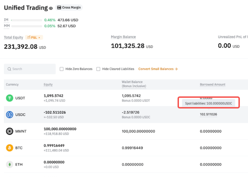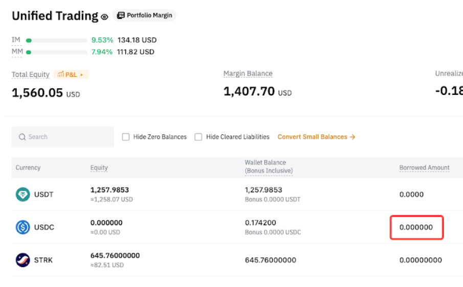 Por ejemplo, si pidió prestado BTC pero actualmente no tiene ninguno, comprar BTC con USDT a través del par BTC/USDT Spot contará automáticamente como un pago. El BTC que recibe se trata como si se hubiera transferido a su cuenta de operaciones unificadas.